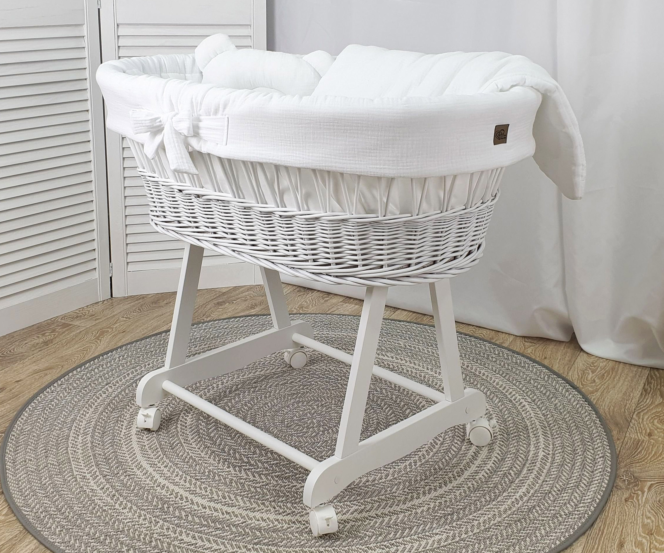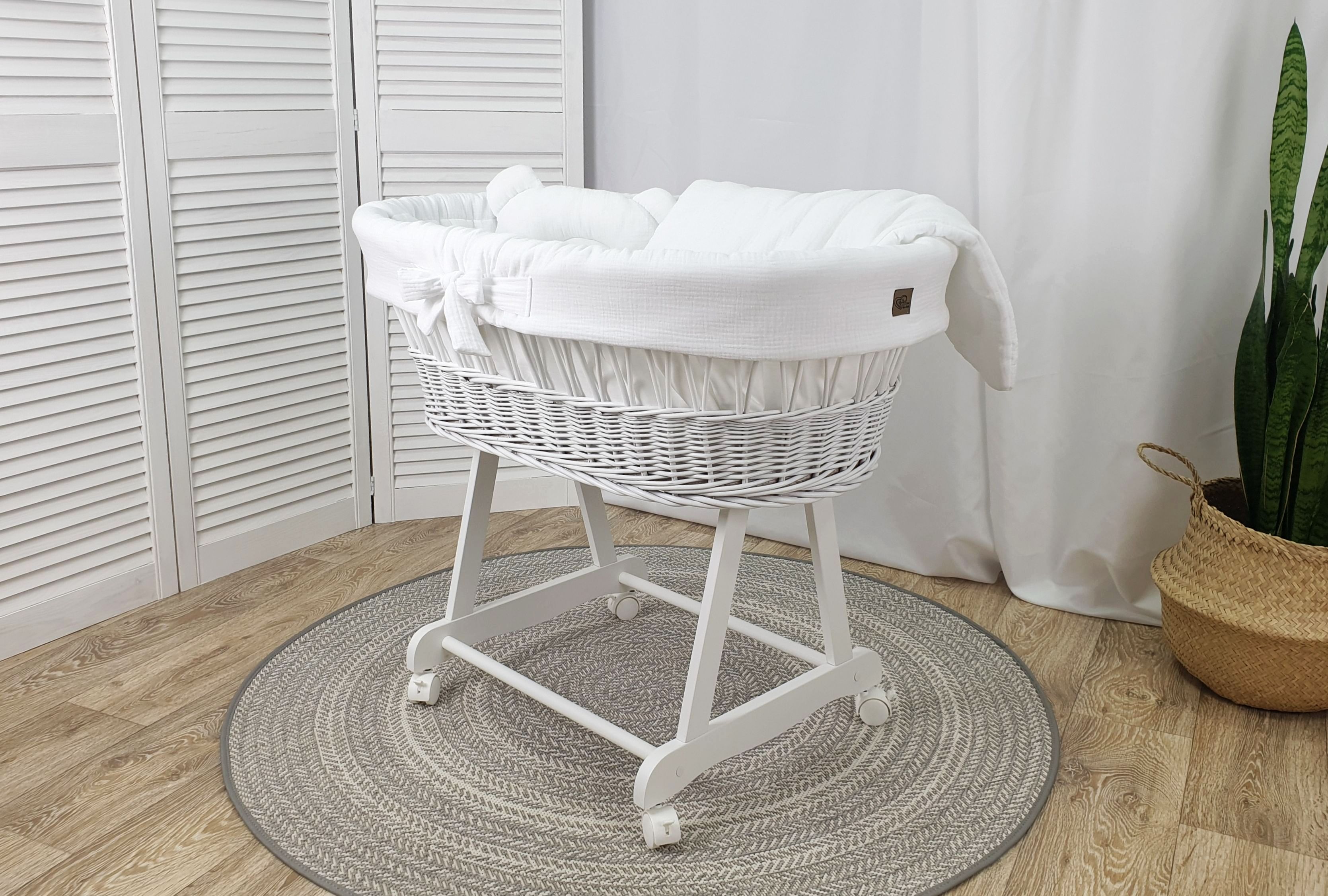 Der geräumige Korb mit den Maßen 90x55x30 cm, geflochten aus natürlicher, hochwertiger polnischer Weide, ist auf einem stabilen Holzgestell mit drehbaren Rollen montiert. So können Sie den Stubenwagen leicht in jeden Raum Ihres Zuhauses schieben, egal ob auf Parkett oder Fliesen. Zwei der vier Rollen sind mit Bremsen ausgestattet, um jederzeit die Sicherheit Ihres Babys zu gewährleisten.