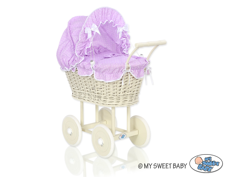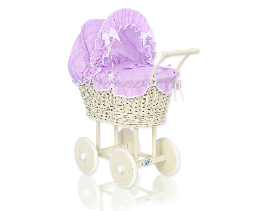 Stubenwagen » Spielzeug Kuscheltiere » Puppenwagen und Spielzeug » Puppenwagen aus Weide » Creme Rattangeflecht Weide Puppenwagen Bettwäsche Lila mit Weiß Punktmuster nr 101699-534
