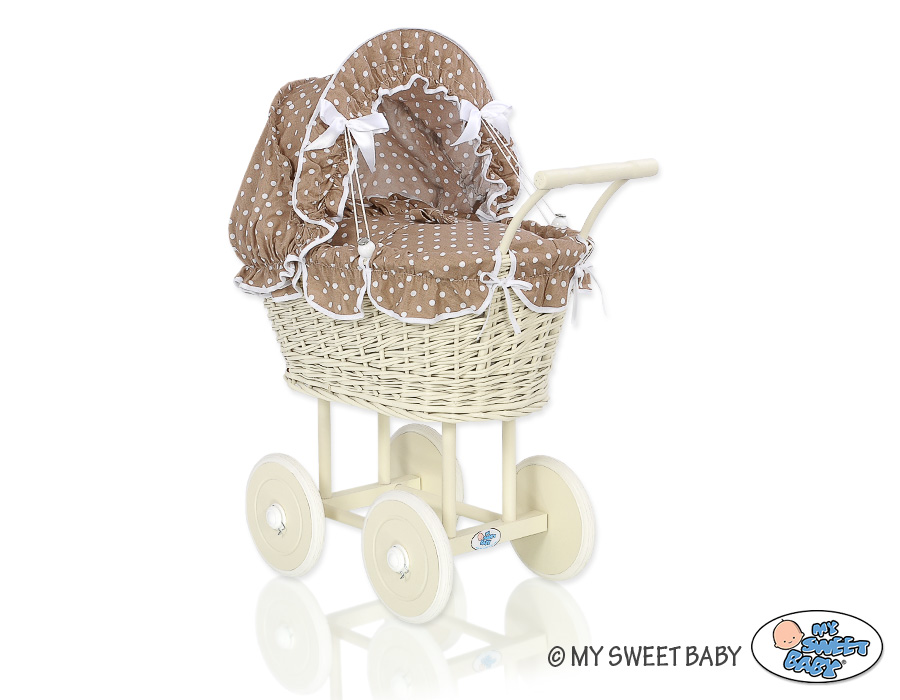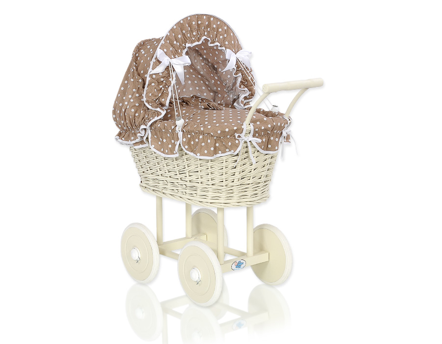 Stubenwagen » Spielzeug Kuscheltiere » Puppenwagen und Spielzeug » Puppenwagen aus Weide » Creme Weide Puppenwagen Bettwäsche Braun Punktmuster nr 101699-584