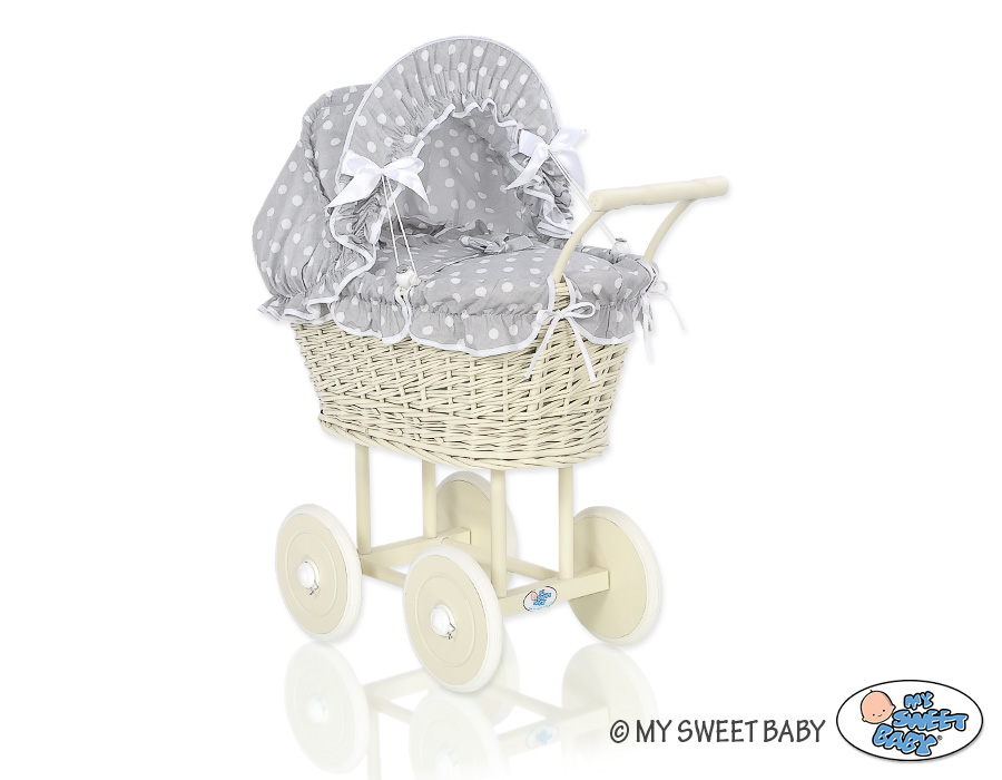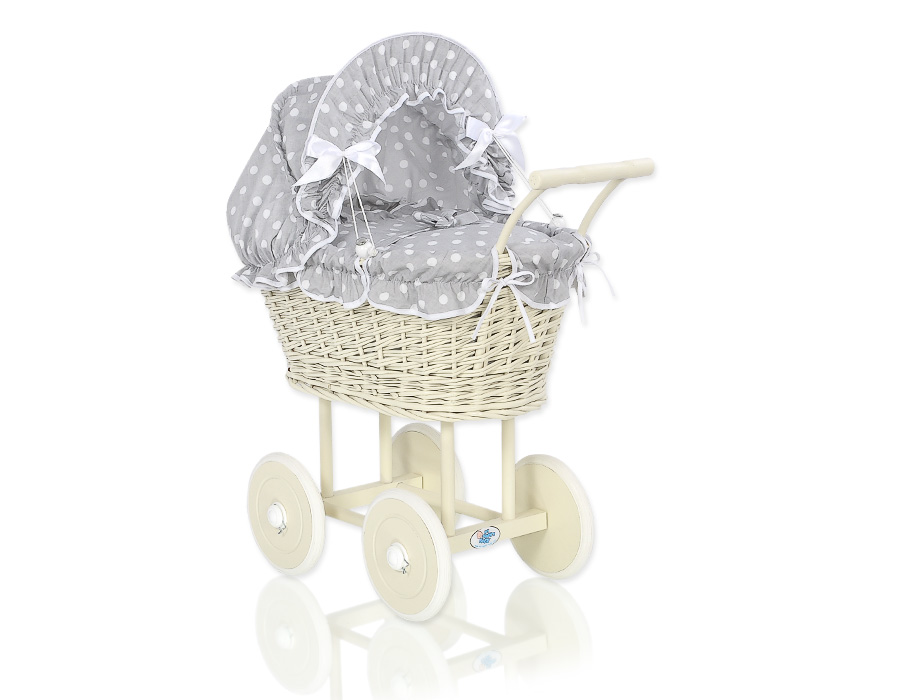 Stubenwagen » Spielzeug Kuscheltiere » Puppenwagen und Spielzeug » Puppenwagen aus Weide » Creme Weide Vintage Puppenwagen Bettwäsche Grau mit Weiß Punktmuster nr 101699-583