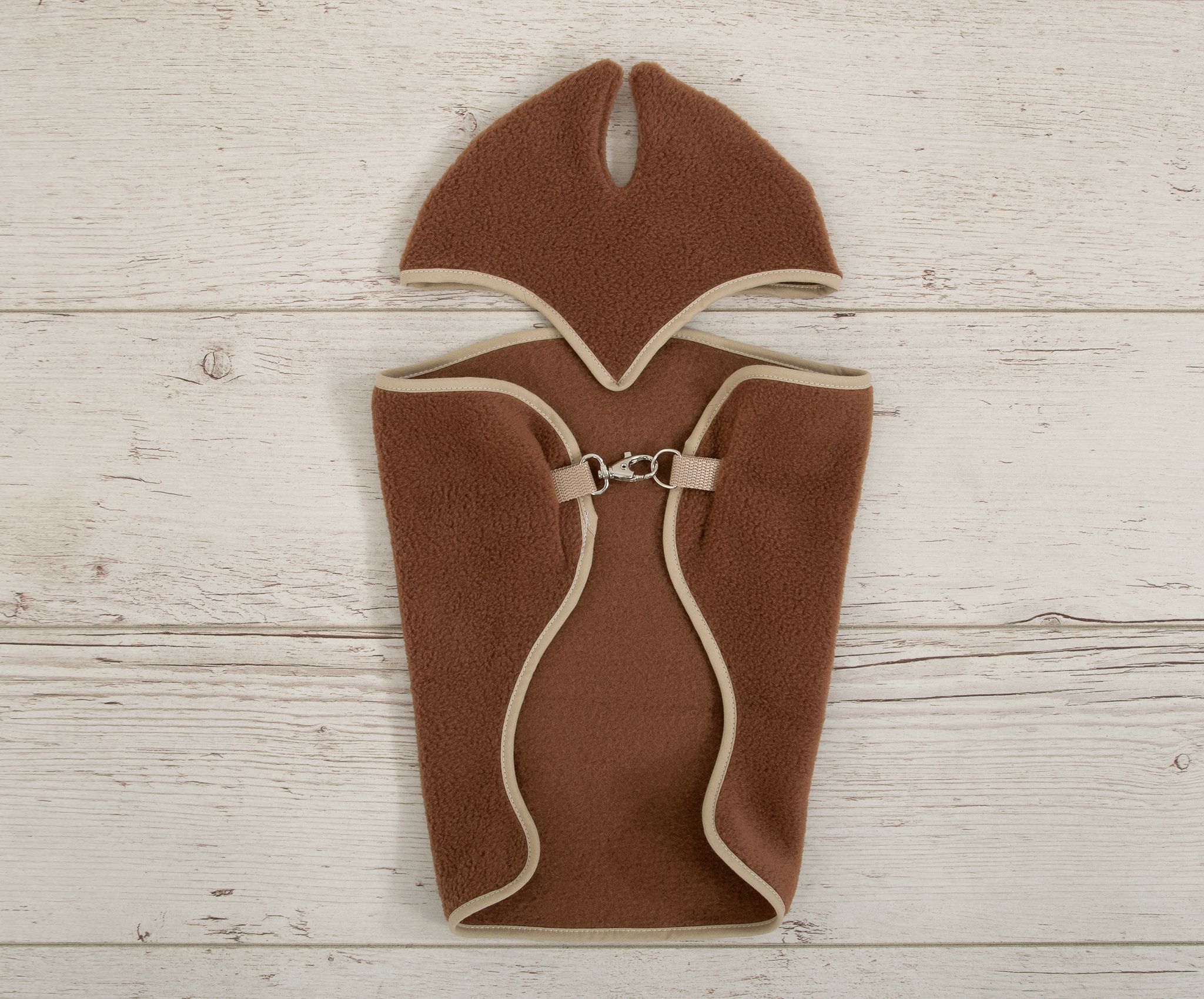 Die Decke und die Ohrenschützer sind aus Fleece mit farblich abgestimmten Umrandungen mit viel Liebe zum Detail gefertigt.  Die Decke wird mit einem Karabinerhaken und einem Halbring in Silber verschlossen.