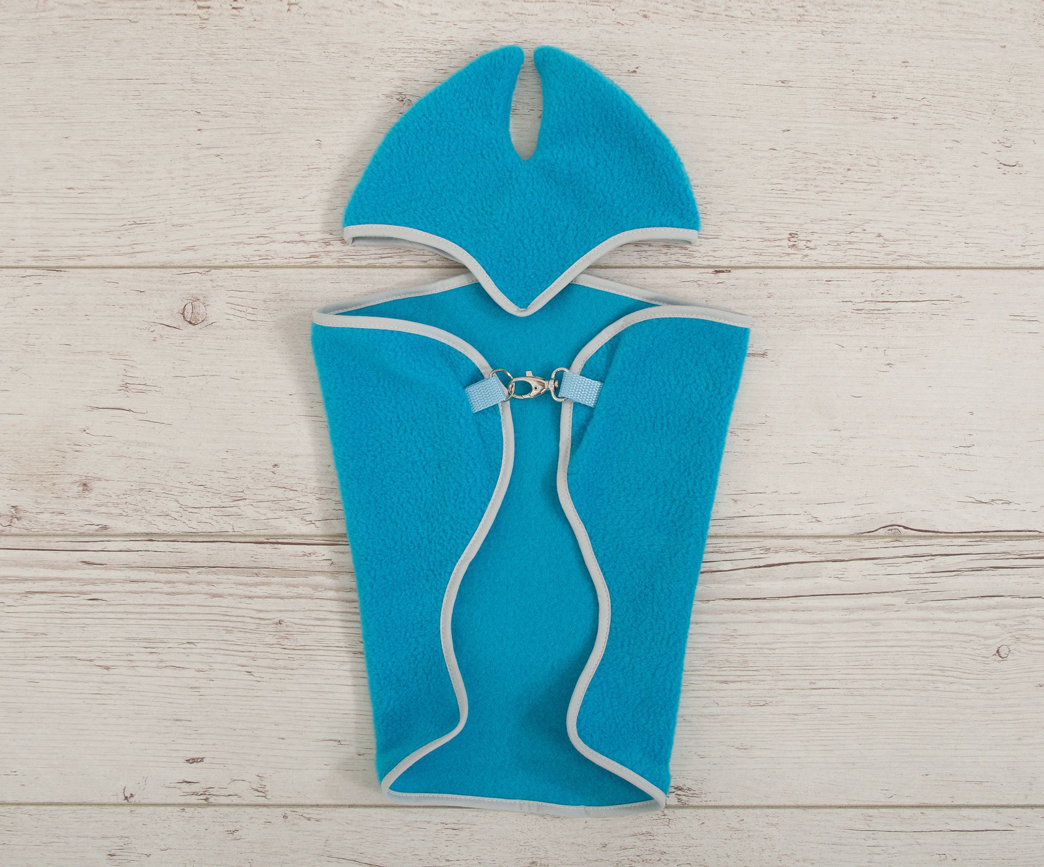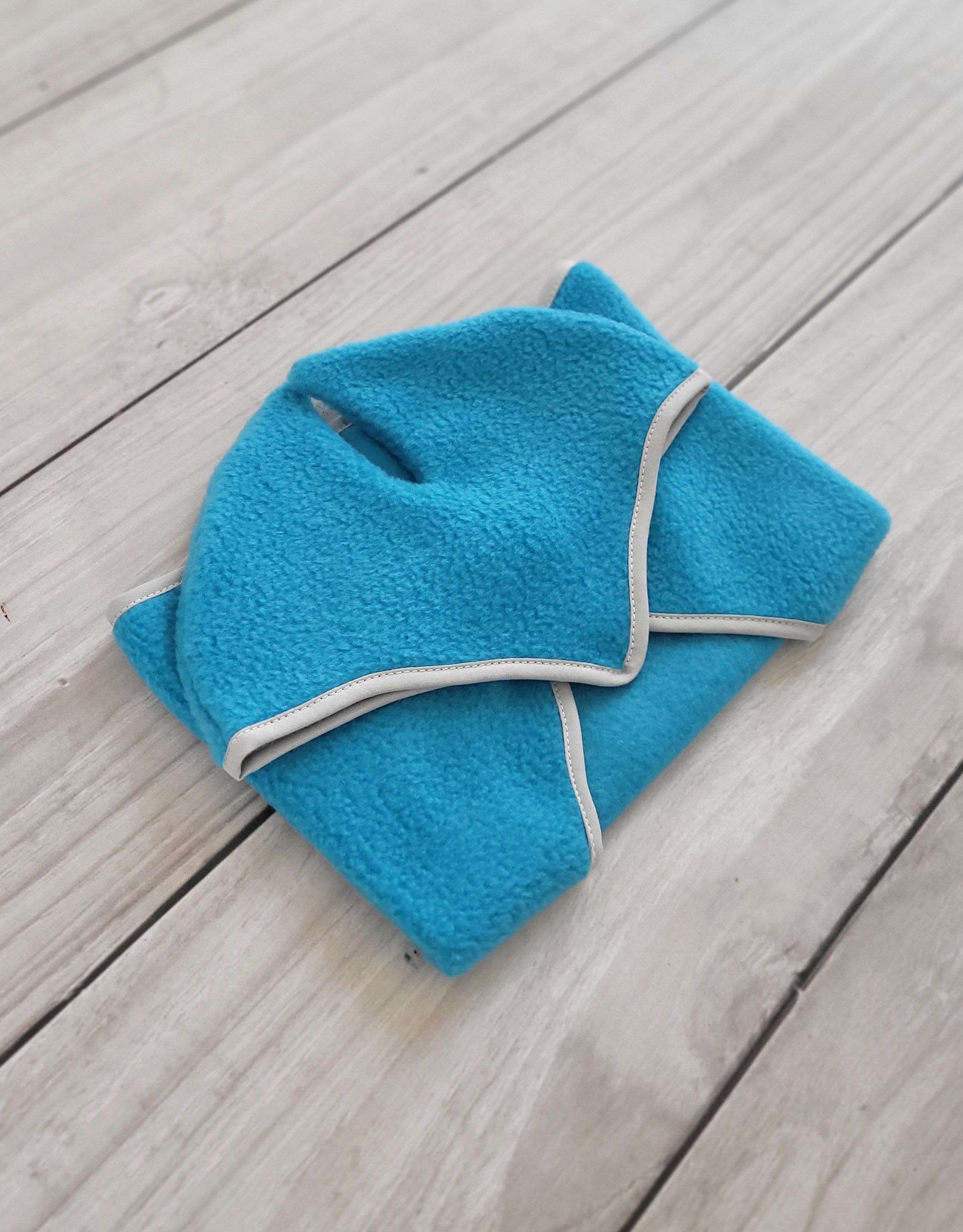Die Decke und die Ohrenschützer sind aus Fleece mit farblich abgestimmten Umrandungen mit viel Liebe zum Detail gefertigt.  Die Decke wird mit einem Karabinerhaken und einem Halbring in Silber verschlossen.