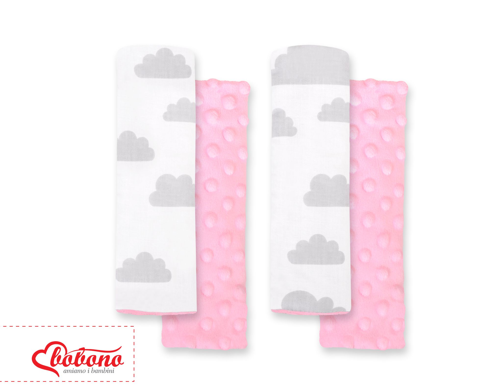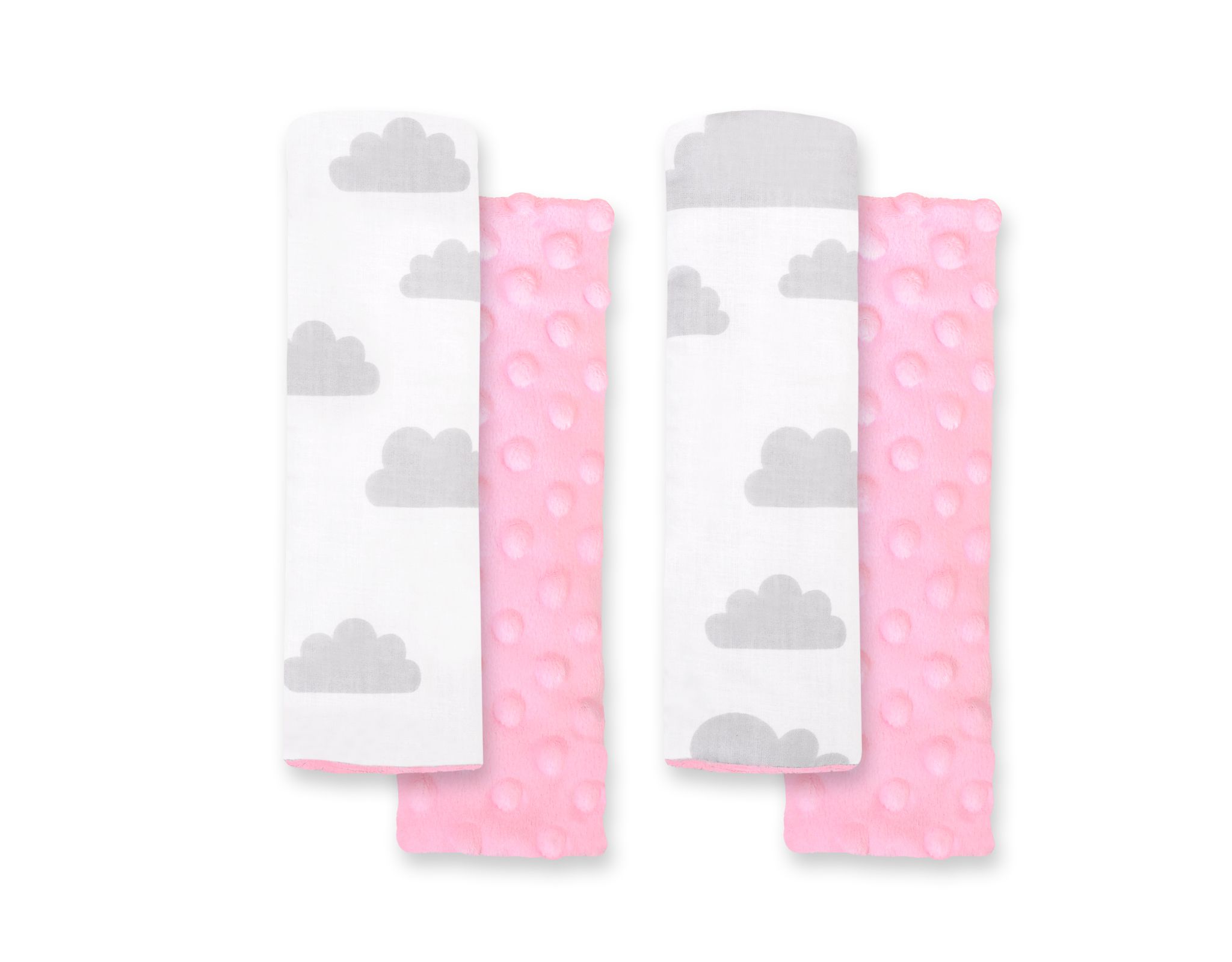 Eine Reihe praktischer Gurtschoner. Hergestellt aus 100% Baumwolle und weichem Minky. Die Gurte werden mit Klettverschluss befestigt, sodass das Anlegen der Gurte nicht lange dauert. Bequeme und weiche Polster bieten Ihrem Kind Komfort. Starre und nicht bequeme Gurte werden nicht länger problematisch sein. Das Set enthält 2 Stück.