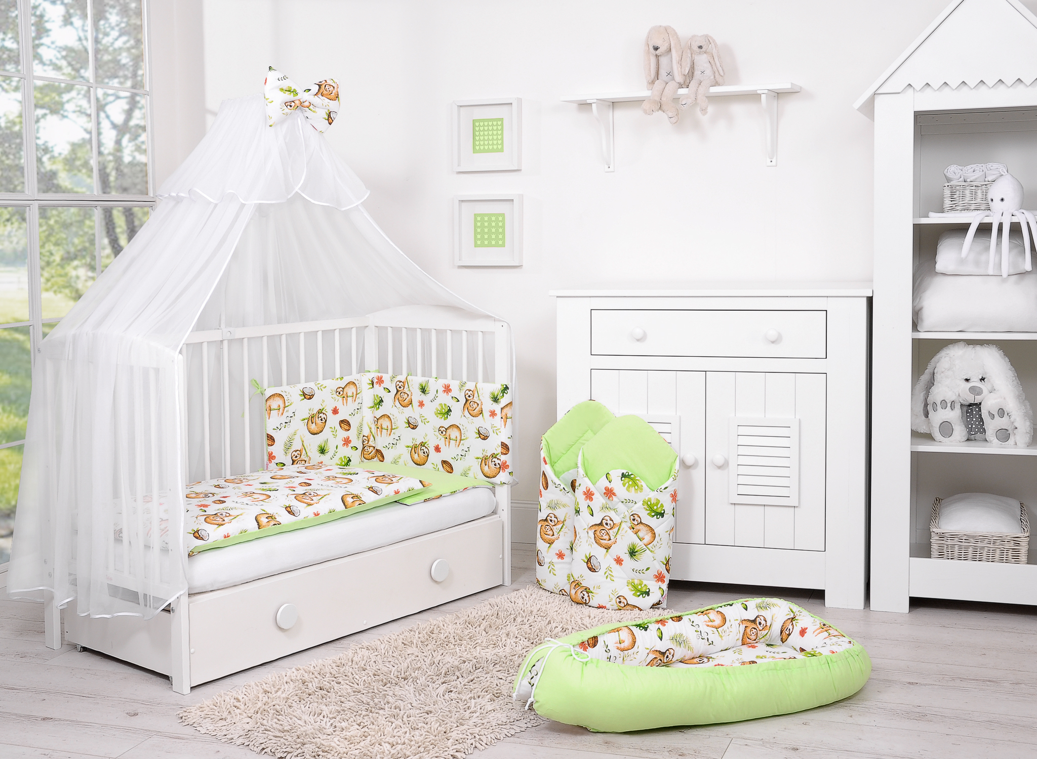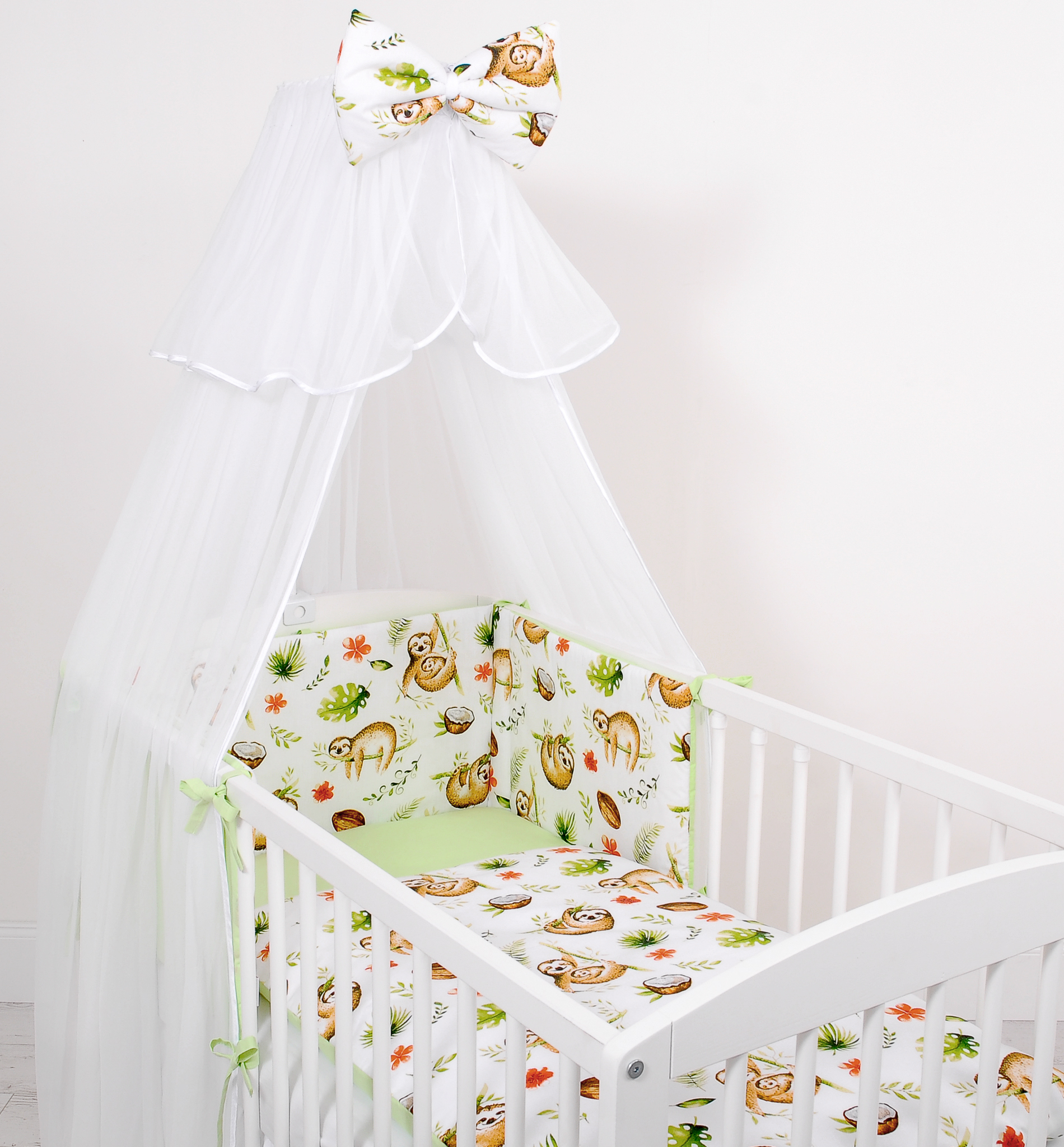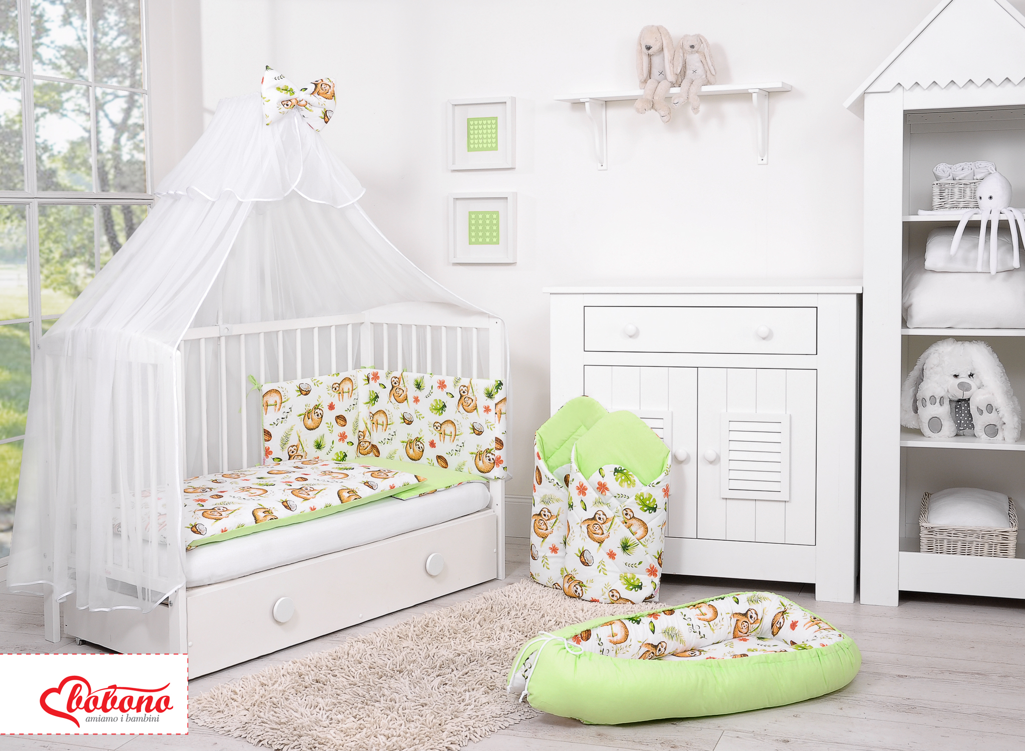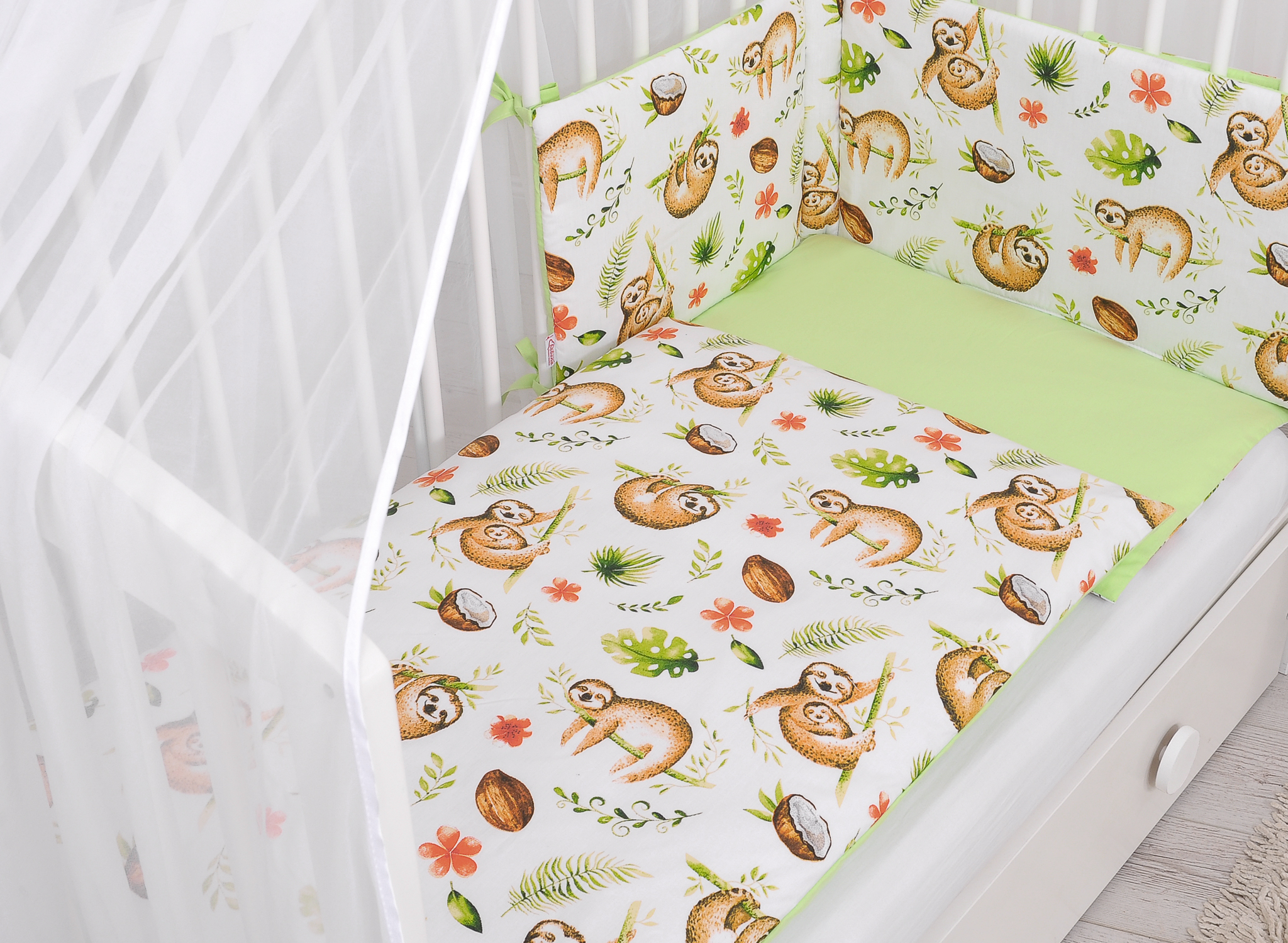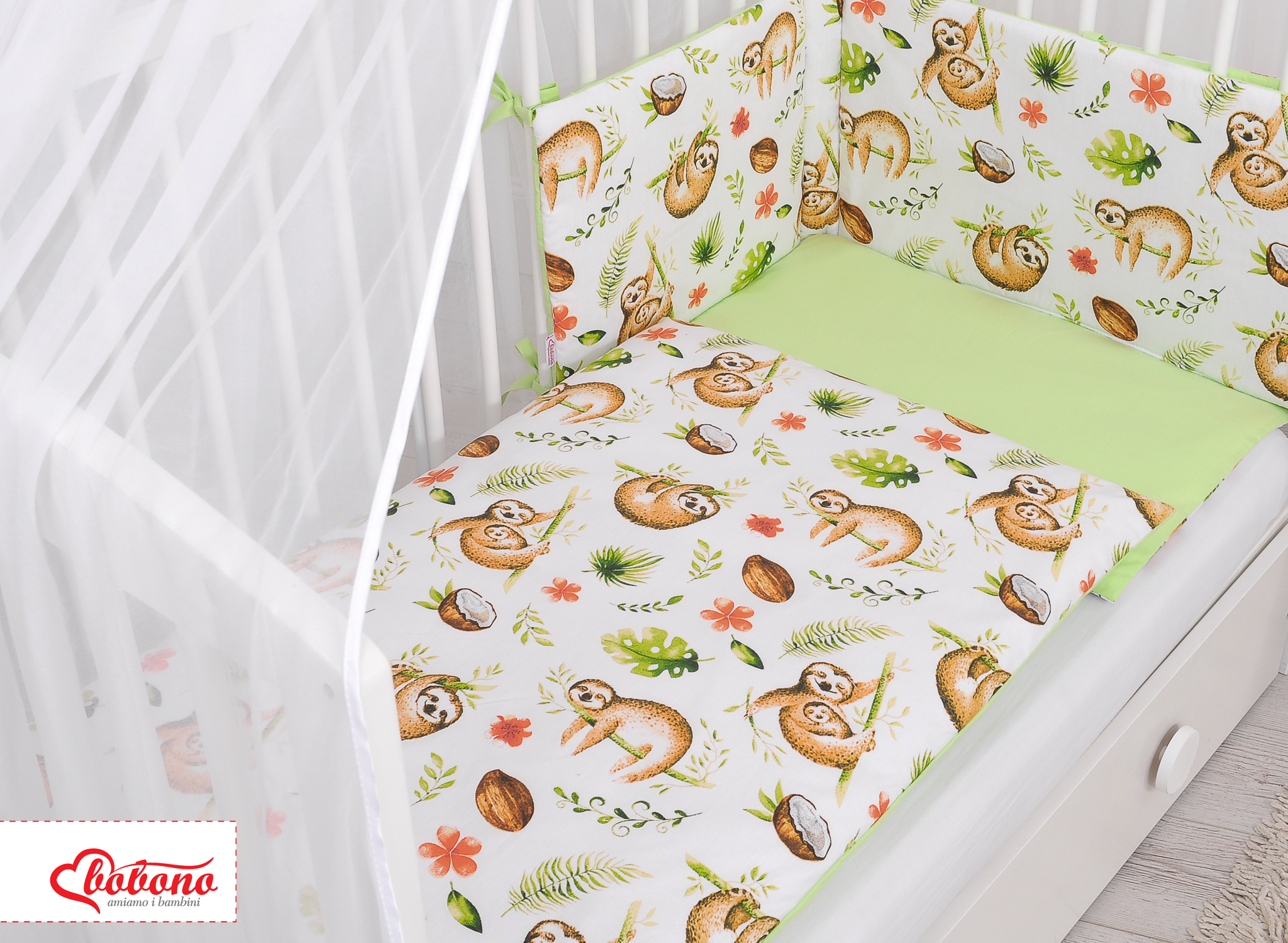 Stubenwagen » Bettwäsche für Babys » Bettwäsche für Babybett FUN & JOY » Bettwäsche Sets für Babybett 120cm » Bettwäsche Set 5-tlg mit Moskitonetz » Doppelseitiges Bettwäsche Set 5-tlg mit Moskitonetz - Faultiere beige/grün