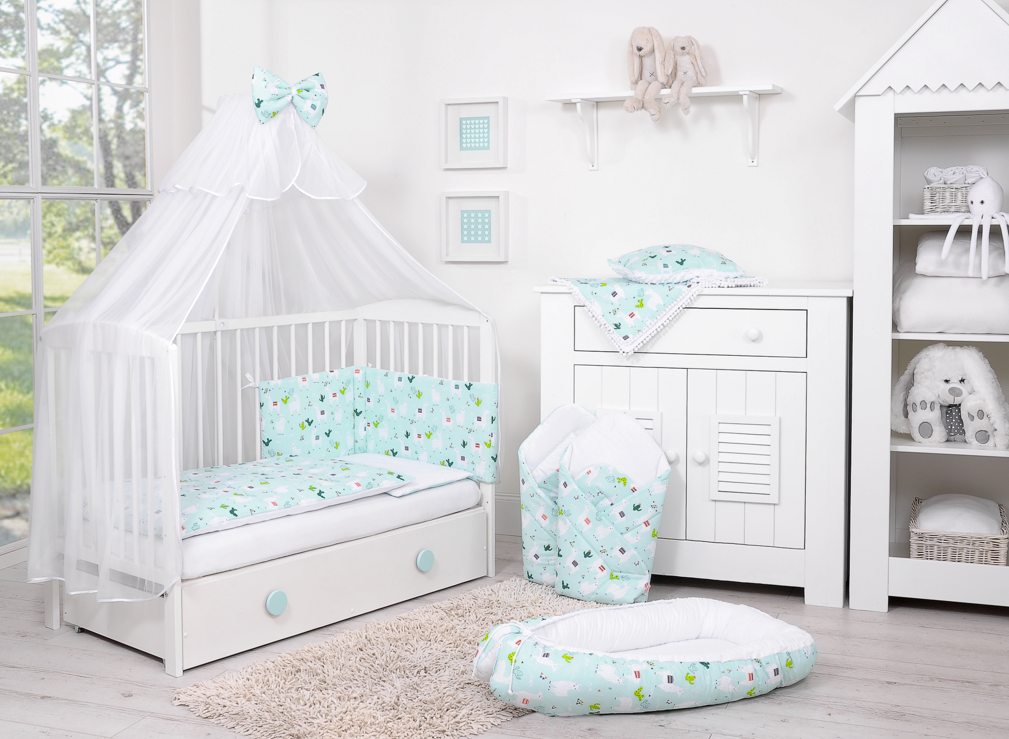 Doppelseitiges Bettwäsche Set 5-tlg mit Moskitonetz - Lamas minze/weiß