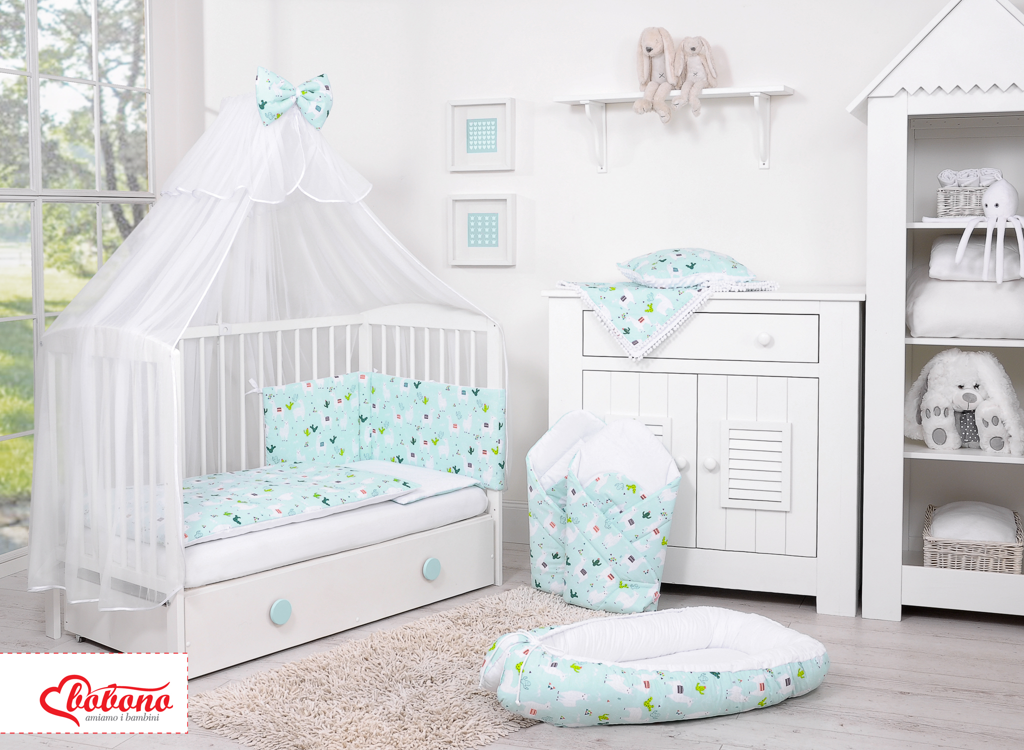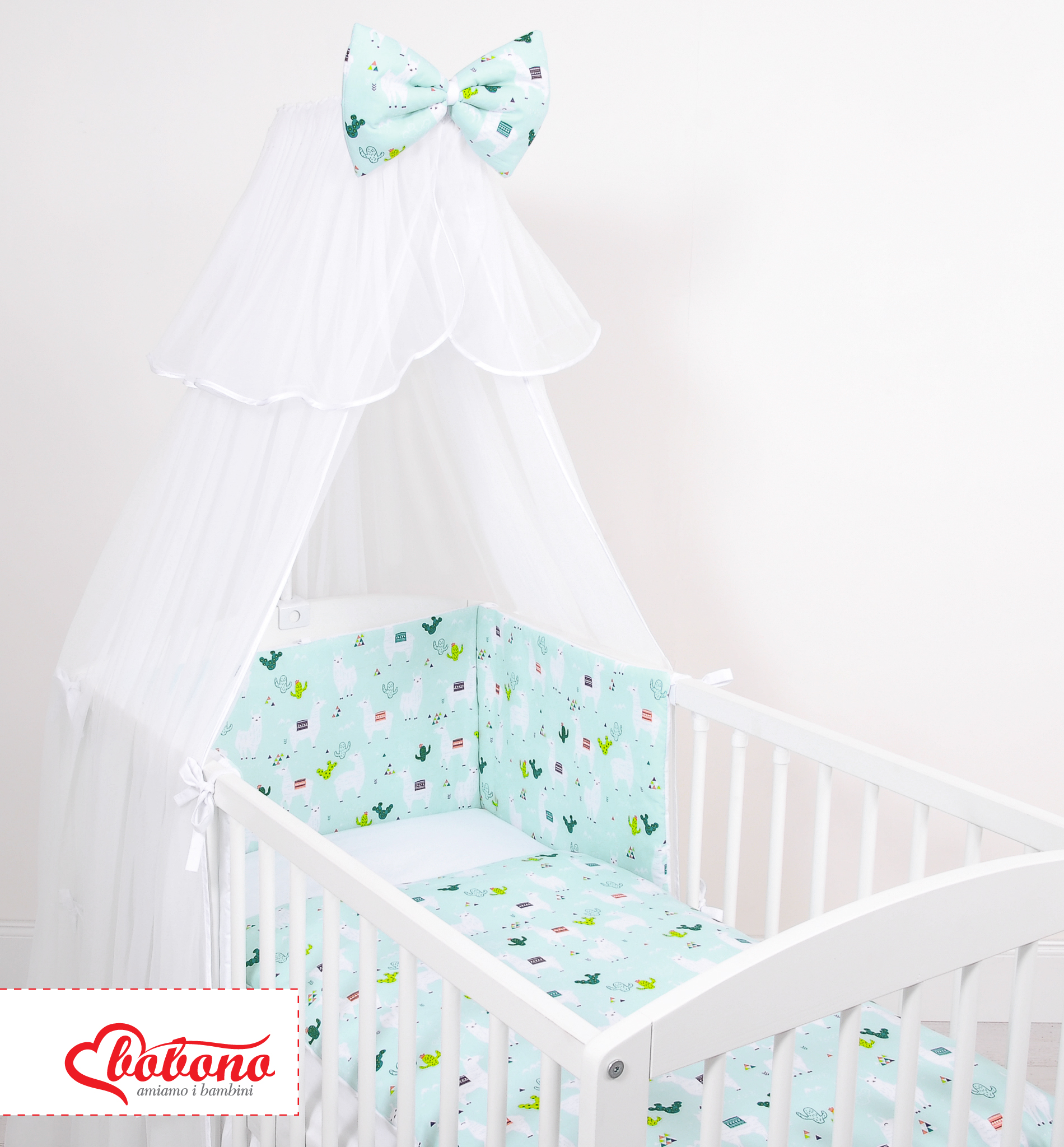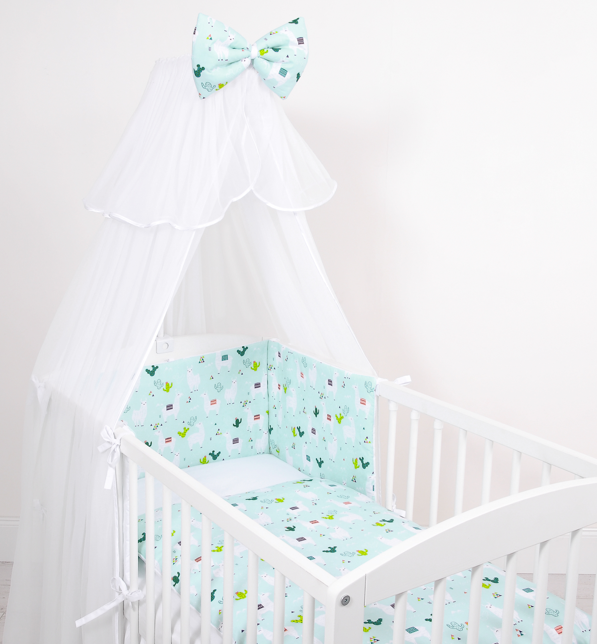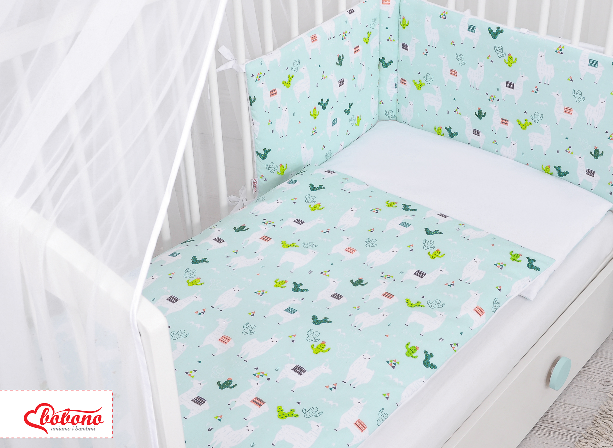 Stubenwagen » Bettwäsche für Babys » Bettwäsche für Babybett FUN & JOY » Bettwäsche Sets für Babybett 120cm » Bettwäsche Set 5-tlg mit Moskitonetz » Doppelseitiges Bettwäsche Set 5-tlg mit Moskitonetz - Lamas minze/weiß