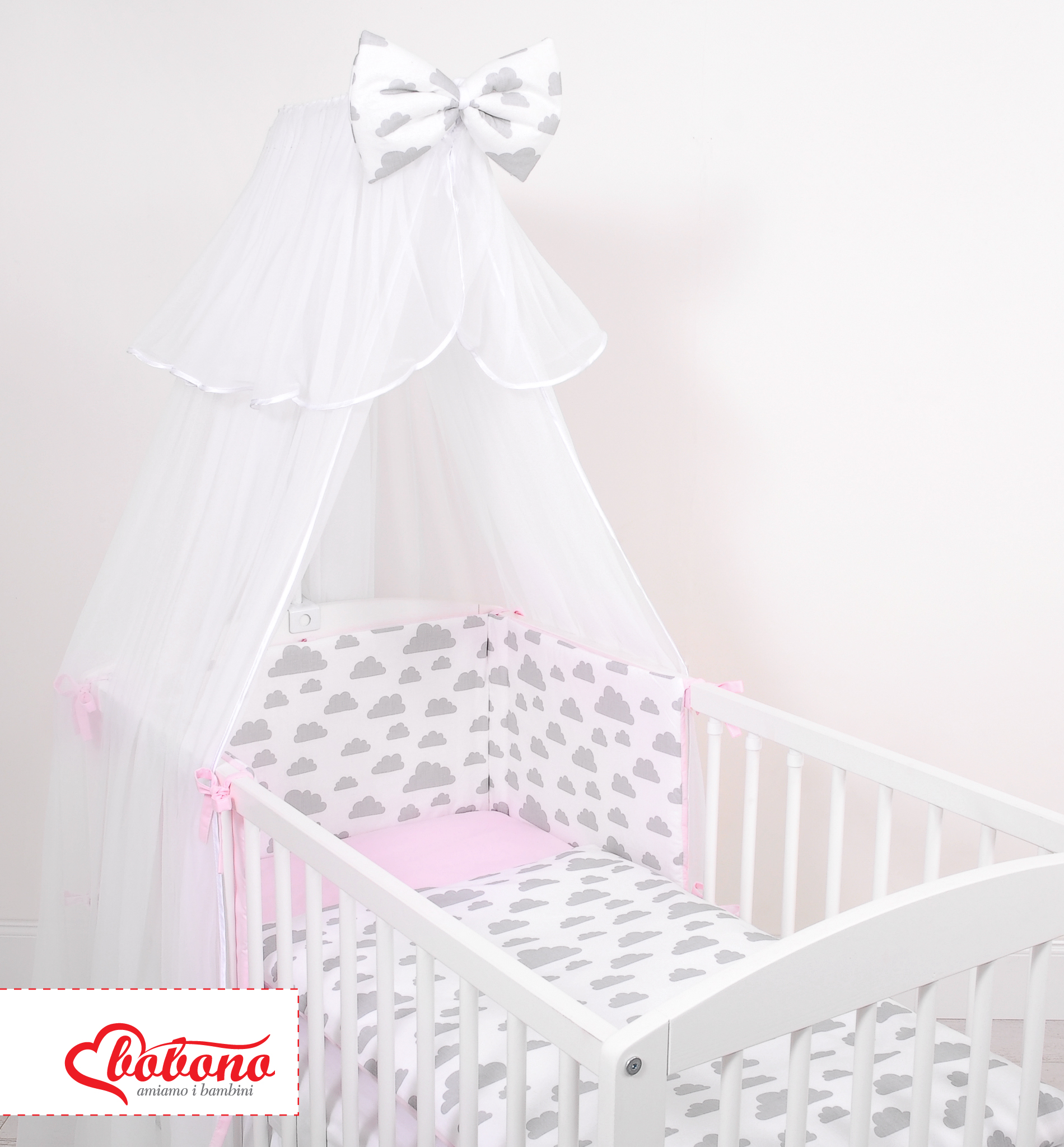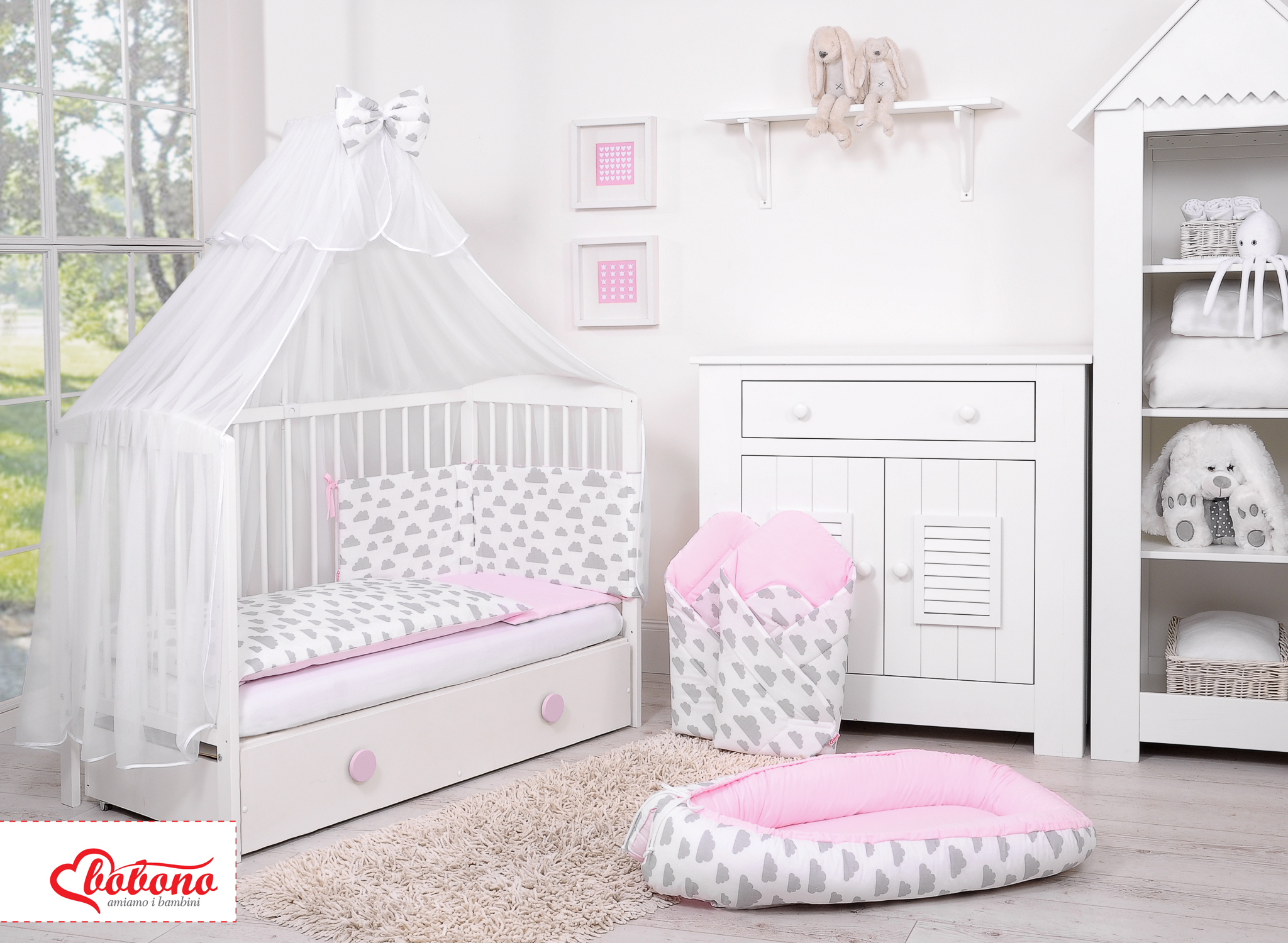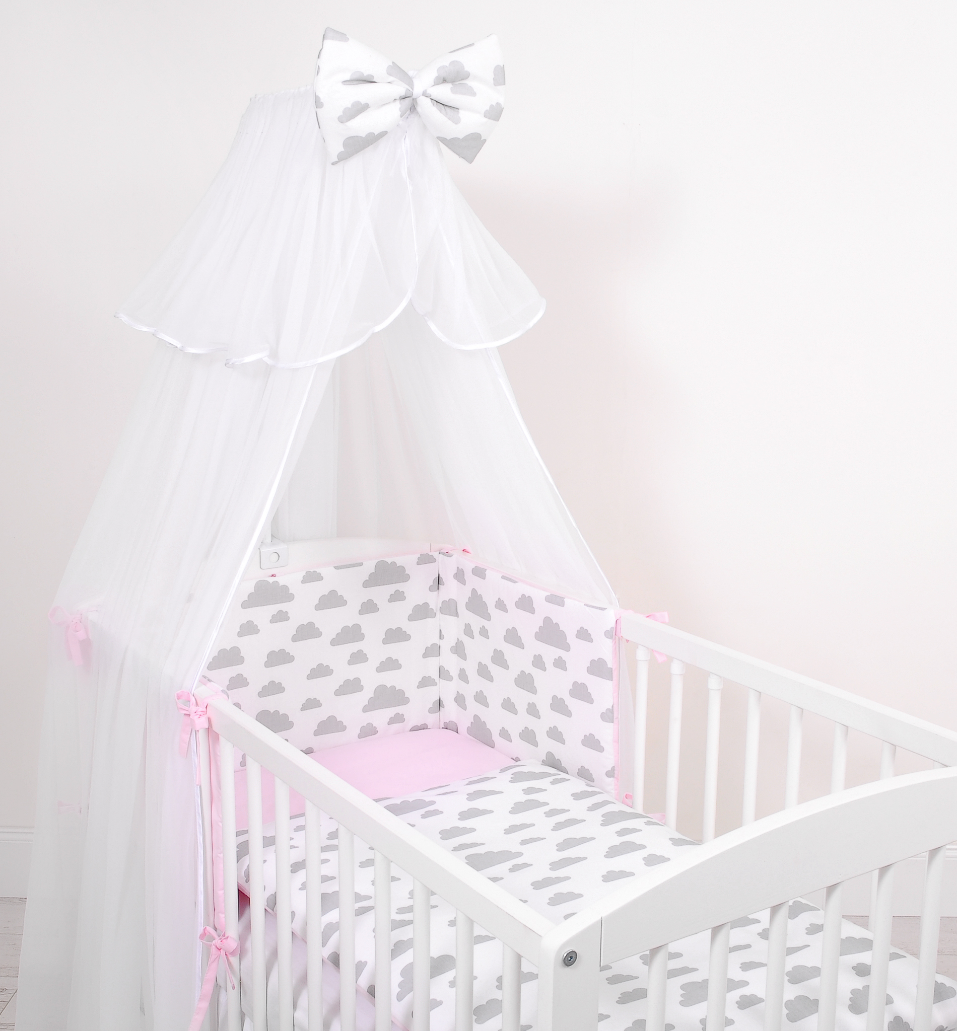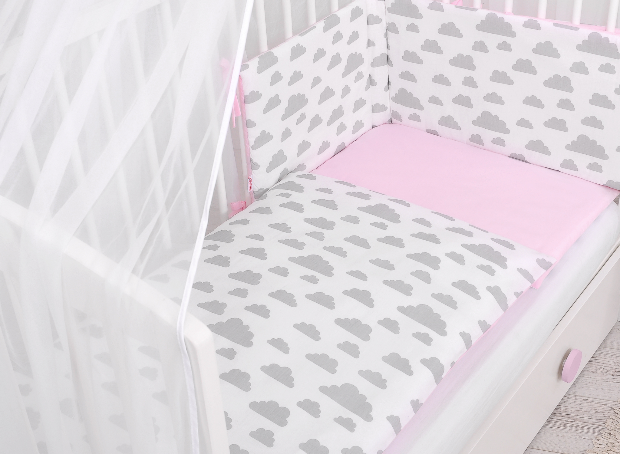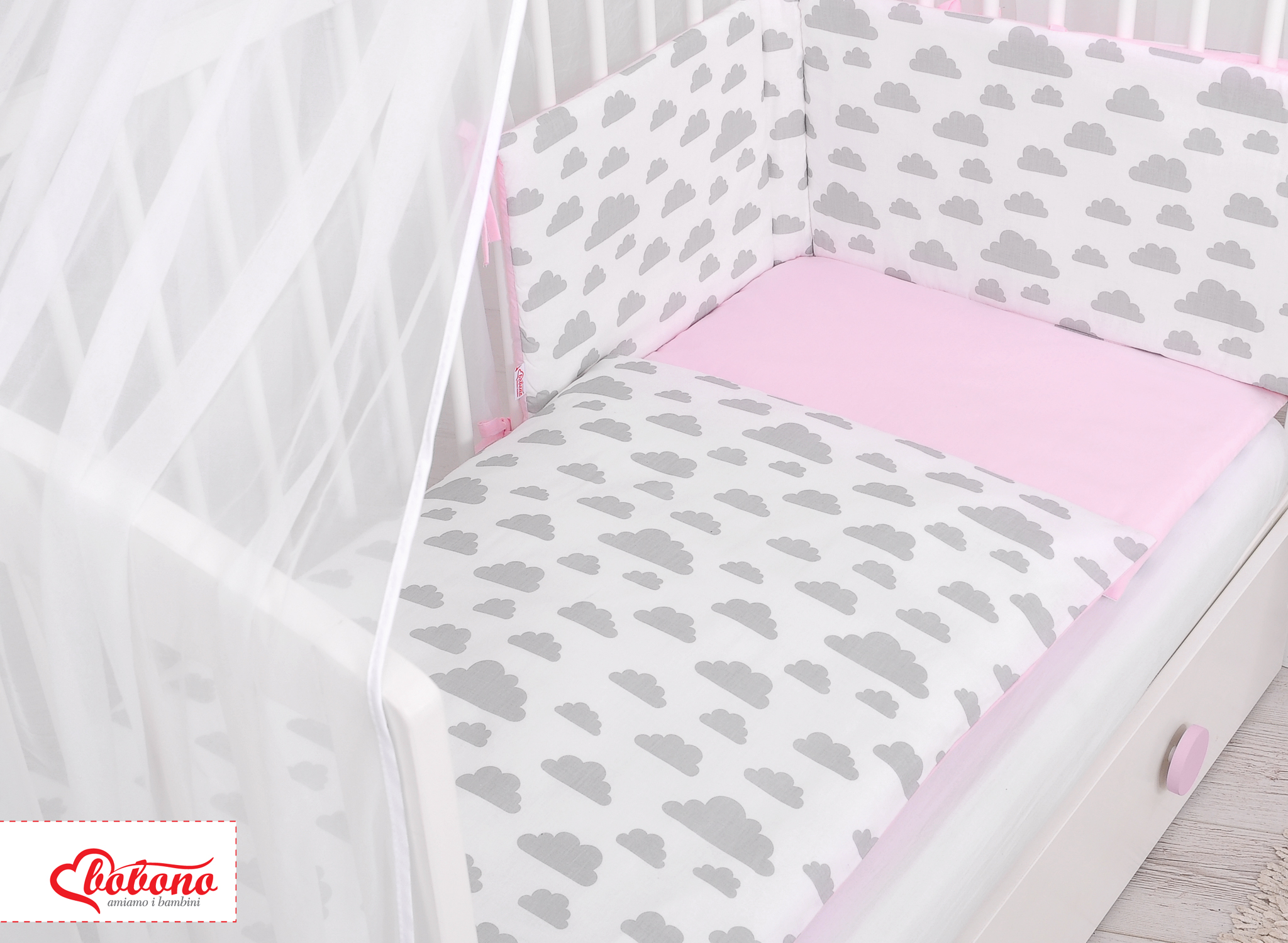 Stubenwagen » Bettwäsche für Babys » Bettwäsche für Babybett FUN & JOY » Bettwäsche Sets für Babybett 120cm » Bettwäsche Set 5-tlg mit Moskitonetz » Doppelseitiges Bettwäsche Set 5-tlg mit Moskitonetz - Wolken grau/rosa