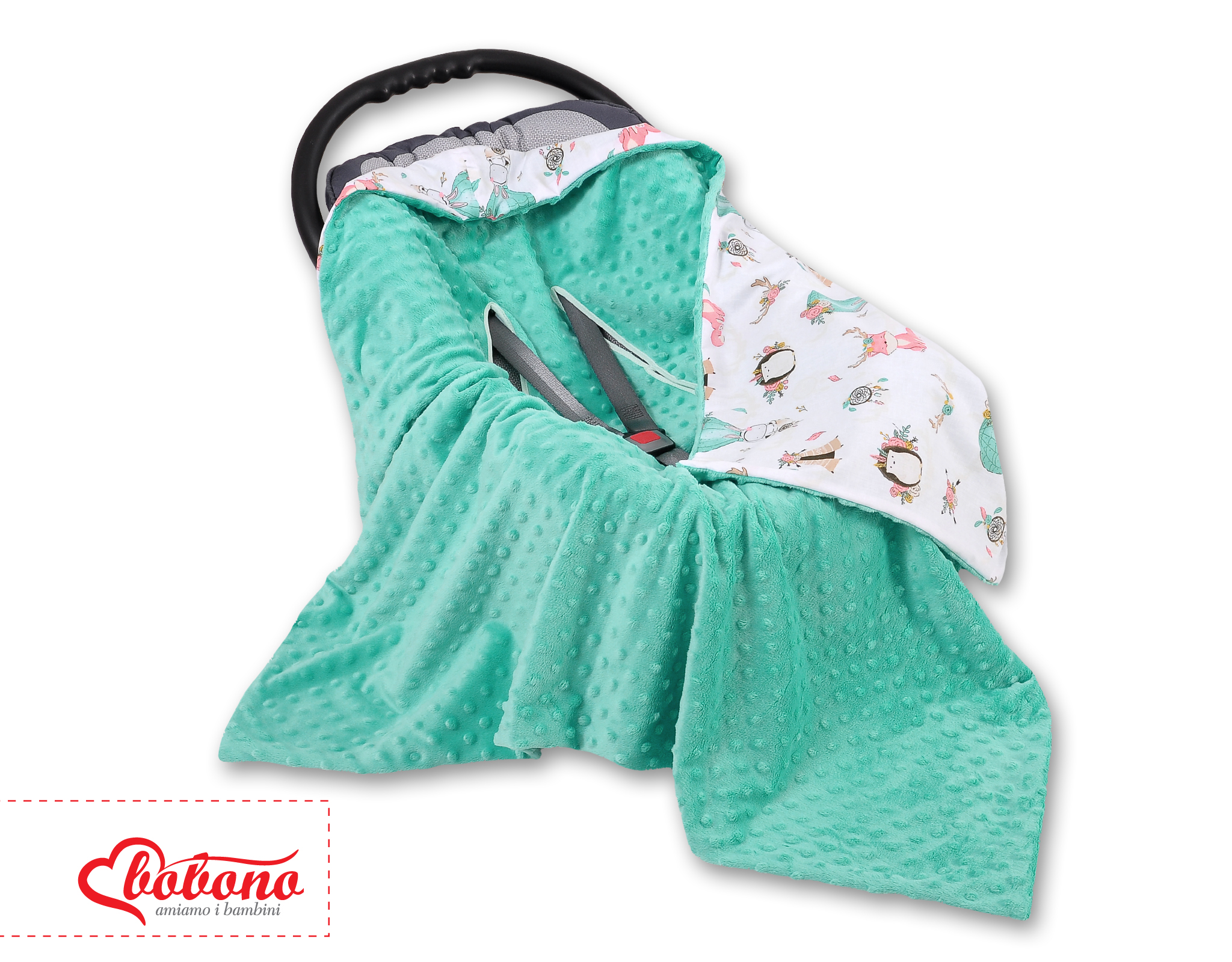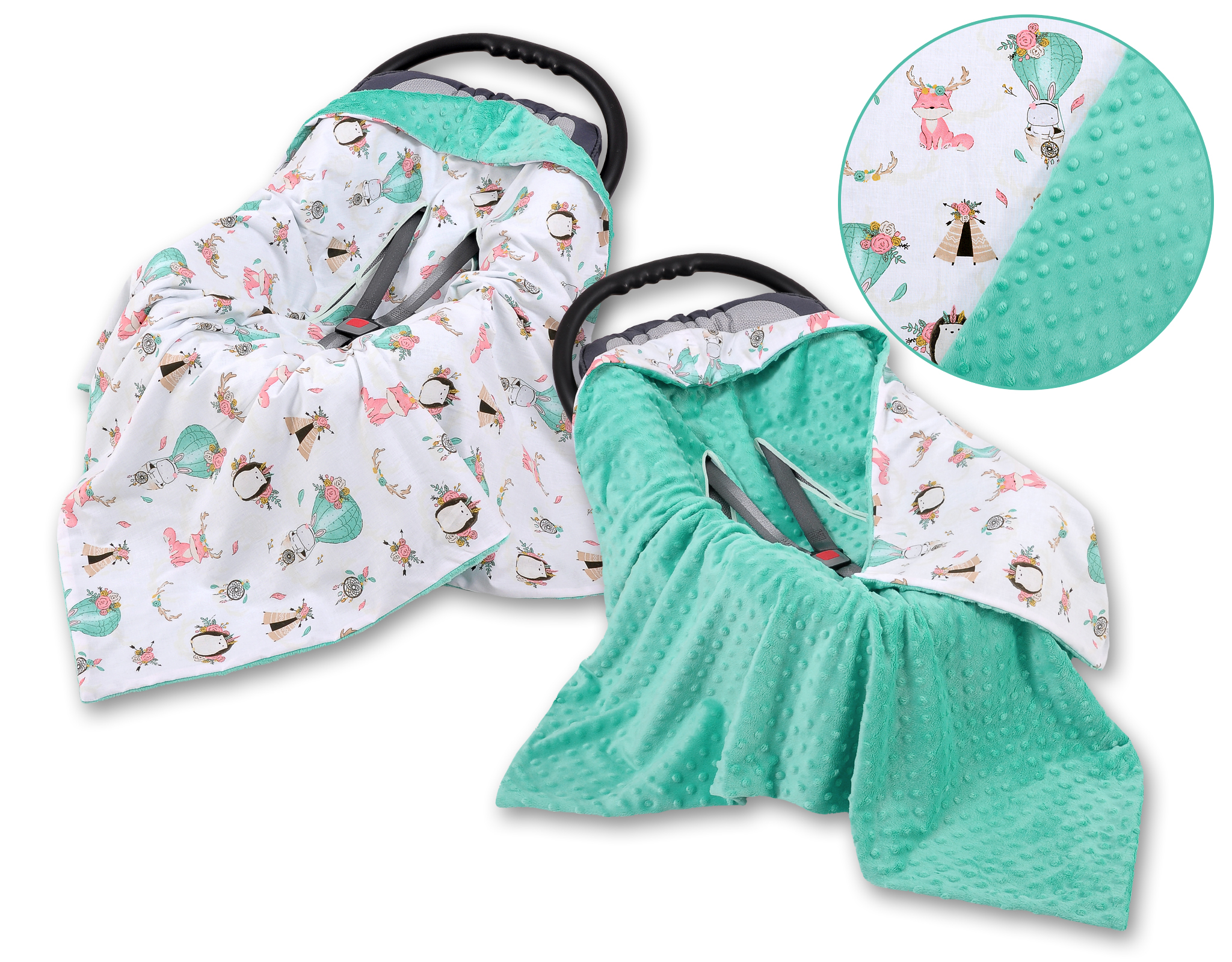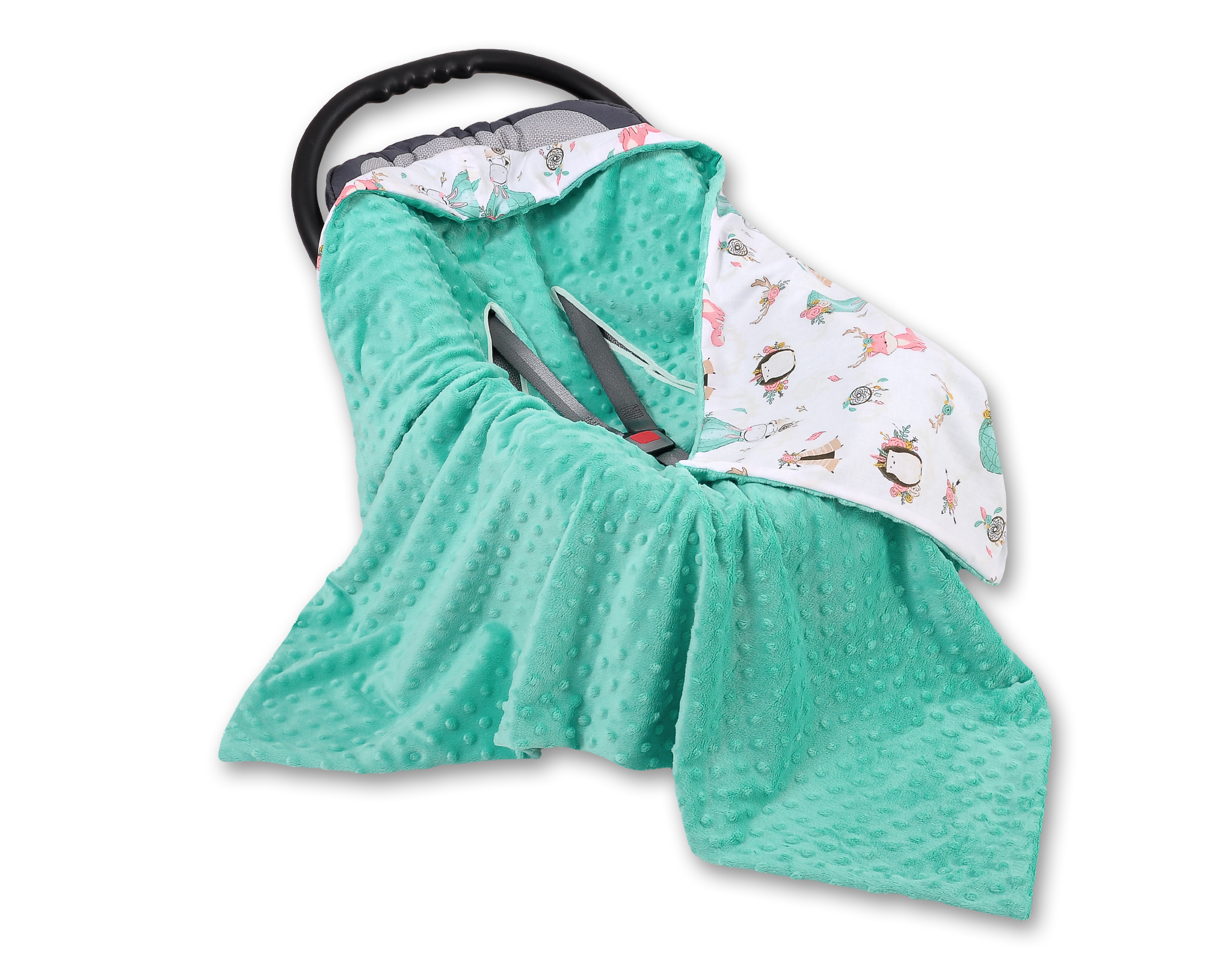 This great warm and fluffy Double- sided car seat blanket. Perfectly protects your child from cold.