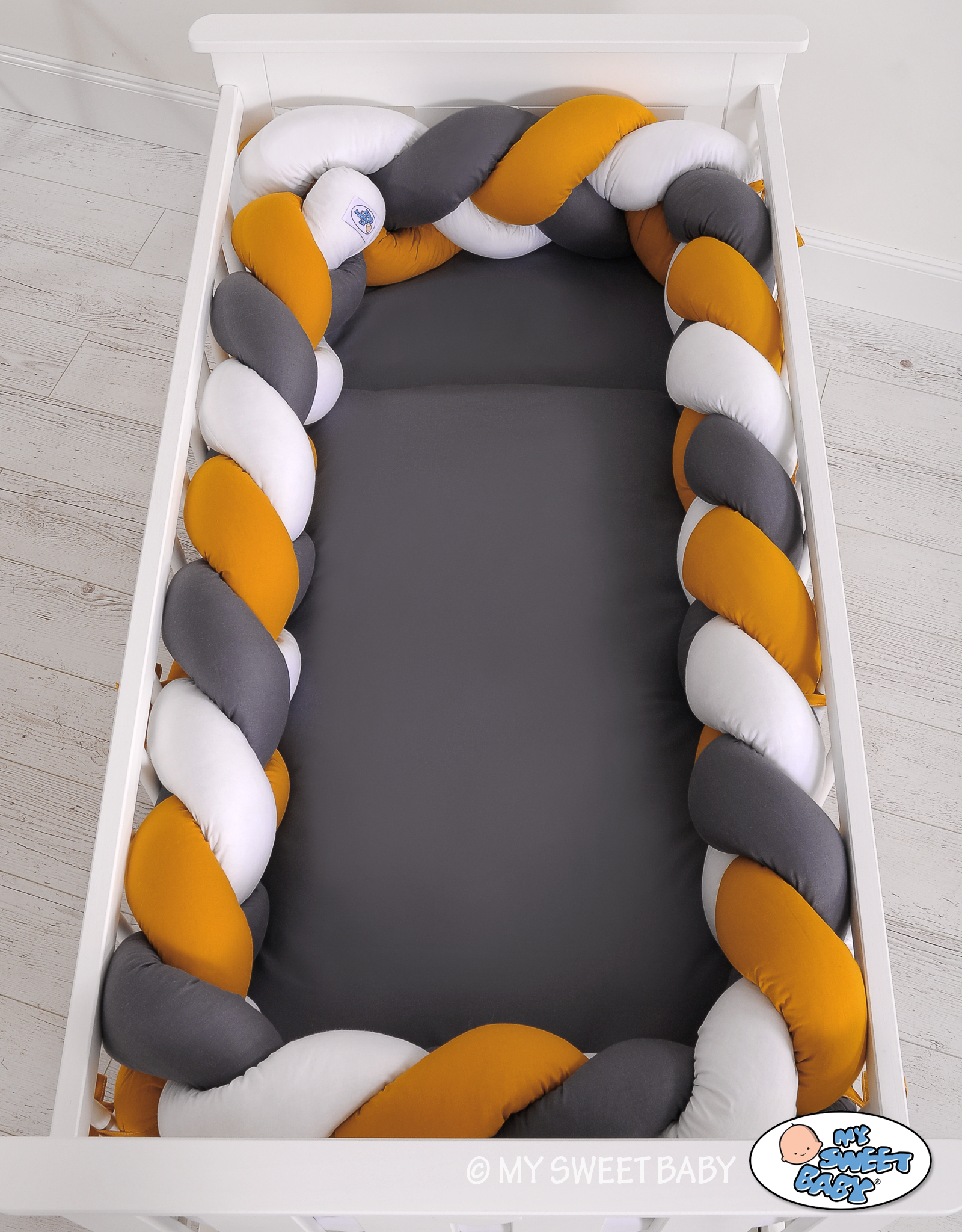 Geflochtene Bettschlange für Babybett XXL - weiß-honiggelb-anthrazit