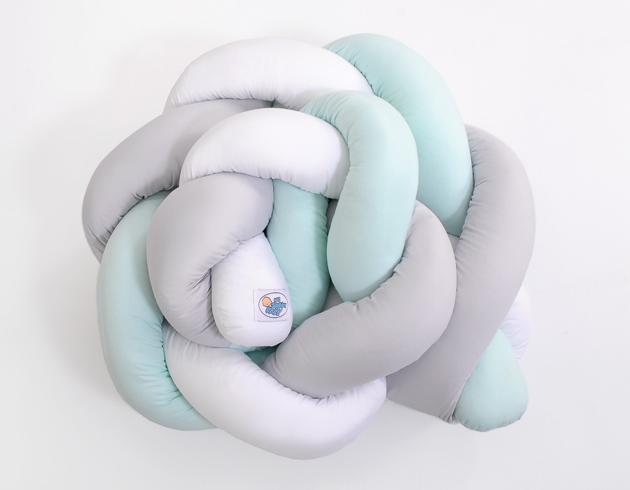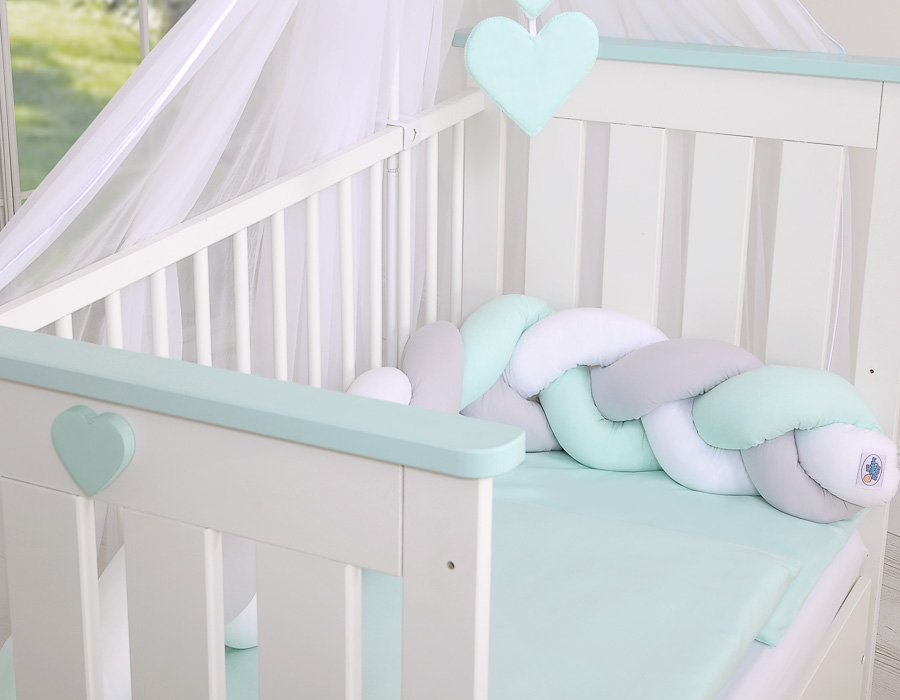 Geflochtene Bettschlange Zopfschlange für Babybett - weiß - grau-minze