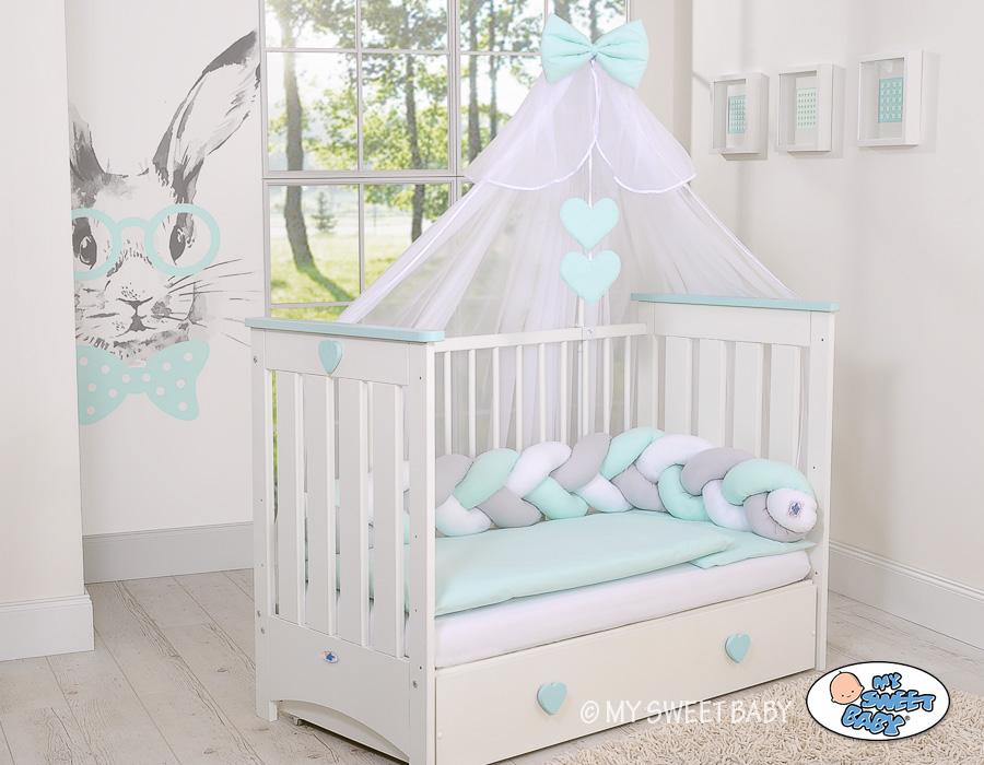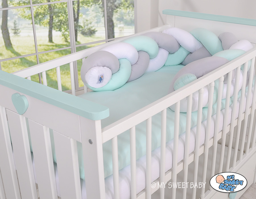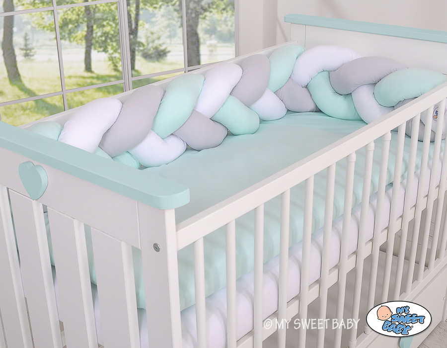 Geflochtene Bettschlange für Babybett - weiß - grau-minze