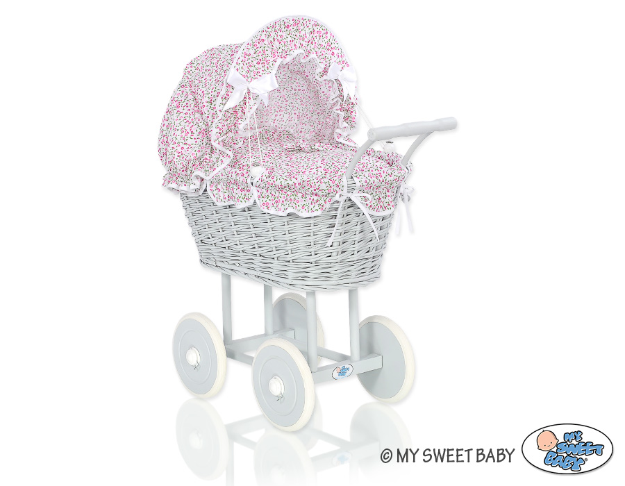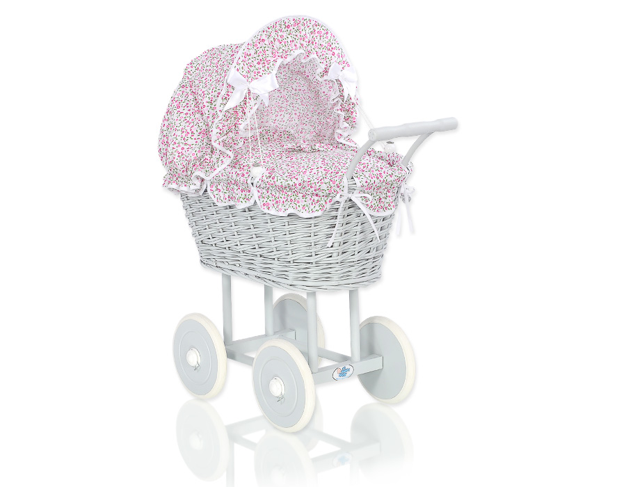 Stubenwagen » Spielzeug Kuscheltiere » Puppenwagen und Spielzeug » Puppenwagen aus Weide » Grau Puppenwagen Bettwäsche rosa Blümchen nr 61699-533