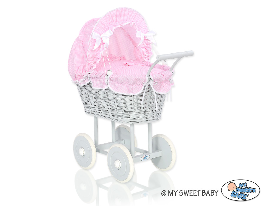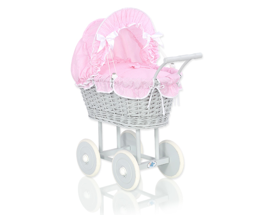 Stubenwagen » Spielzeug Kuscheltiere » Puppenwagen und Spielzeug » Puppenwagen aus Weide » Grau Puppenwagen Bettwäsche Rosa Kariert nr 61699-377
