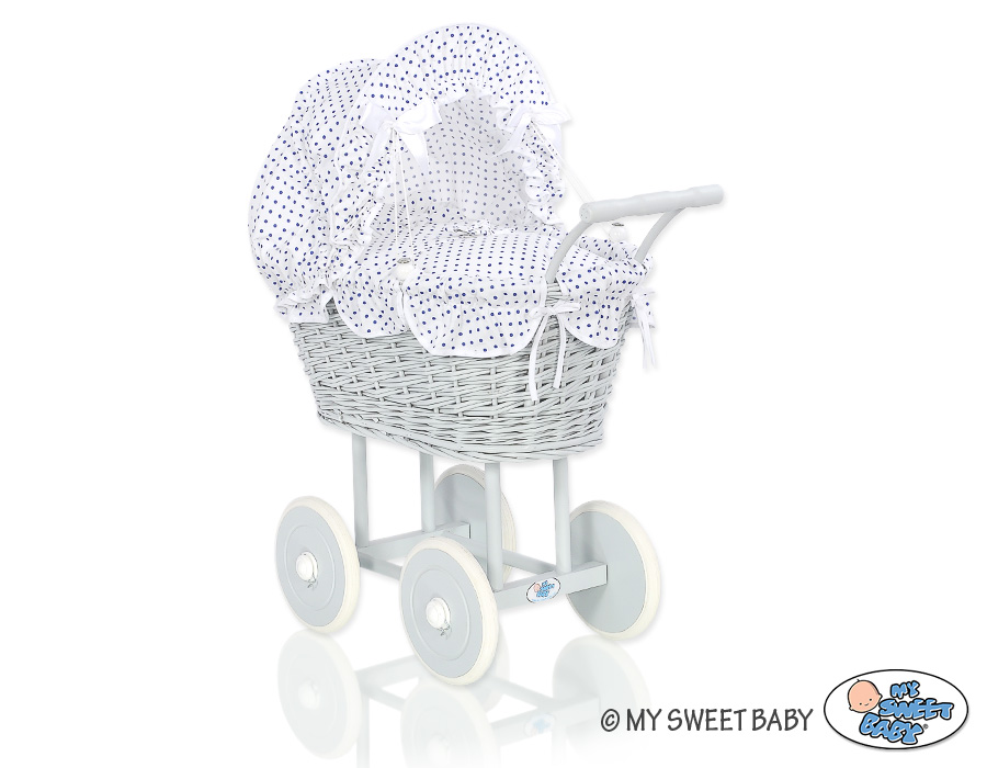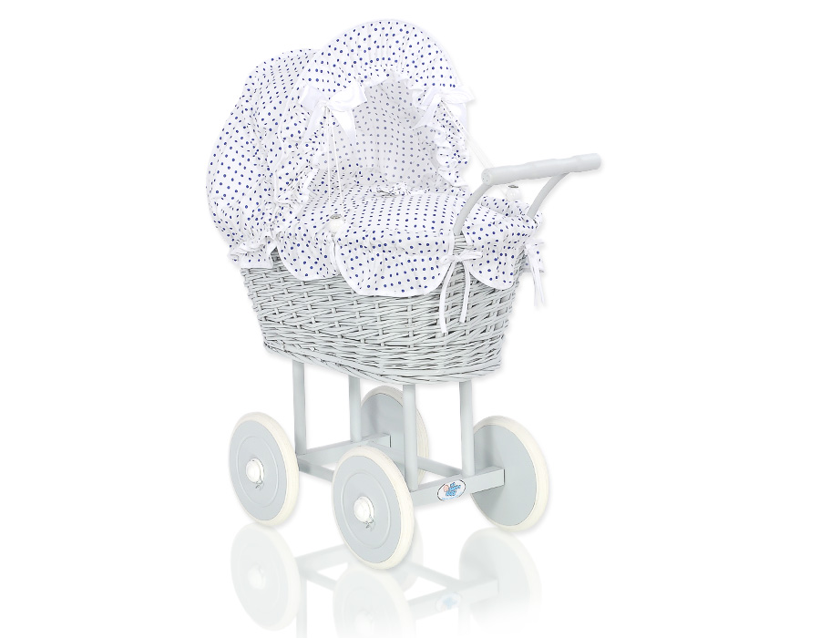 Stubenwagen » Spielzeug Kuscheltiere » Puppenwagen und Spielzeug » Puppenwagen aus Weide » Grau Puppenwagen Bettwäsche Weiß mit Marineblau Punktemuster nr 61699-727