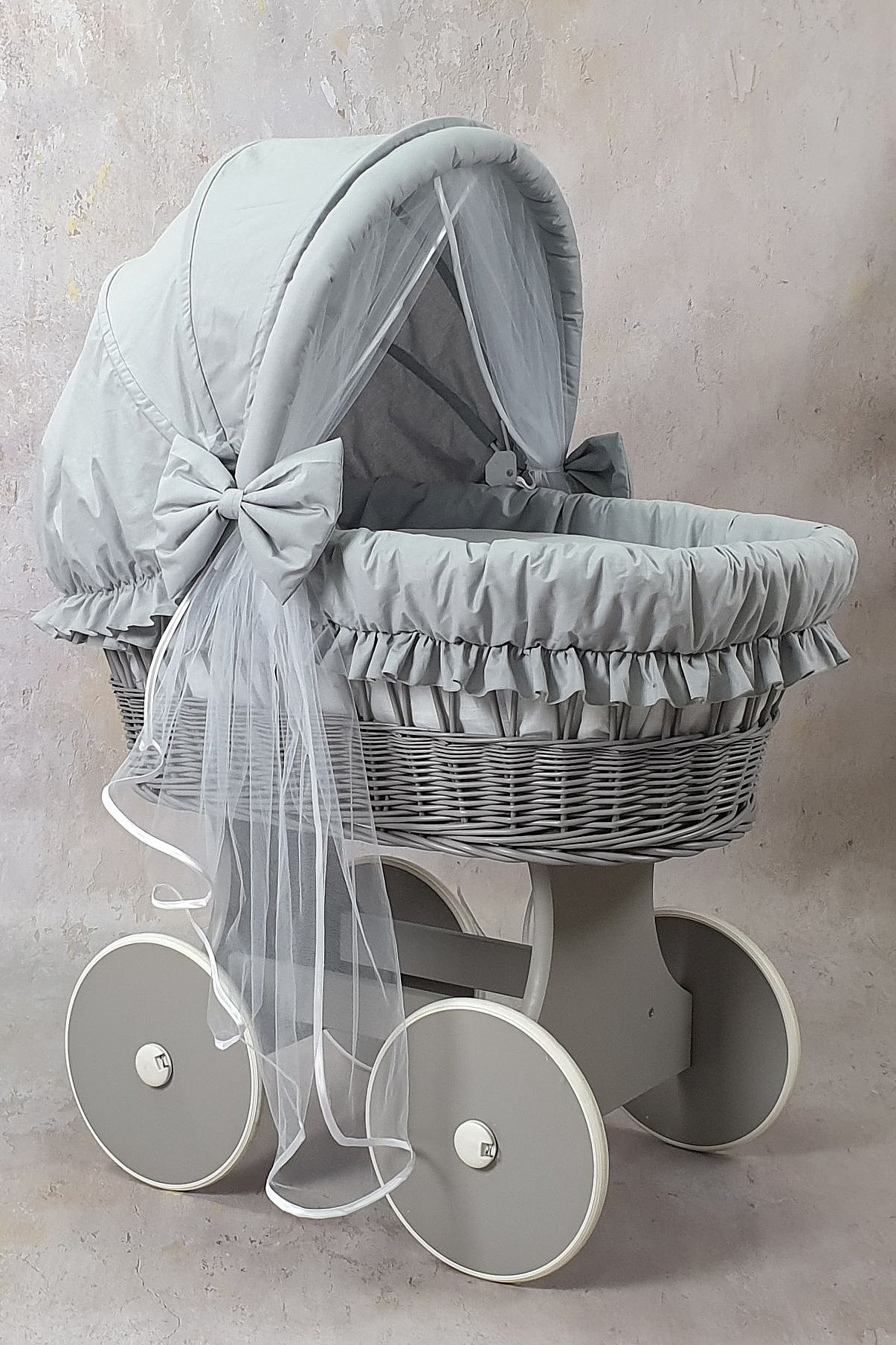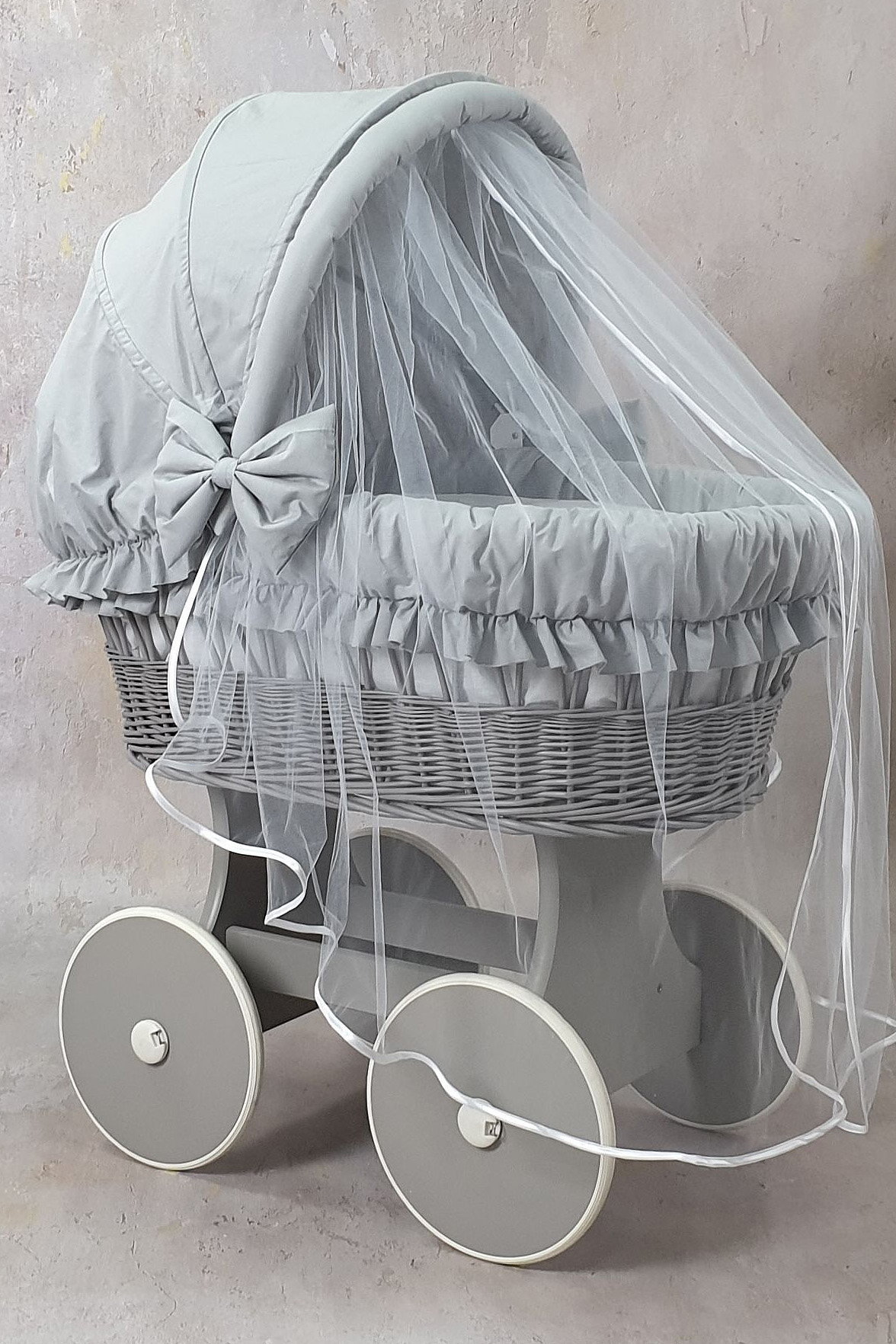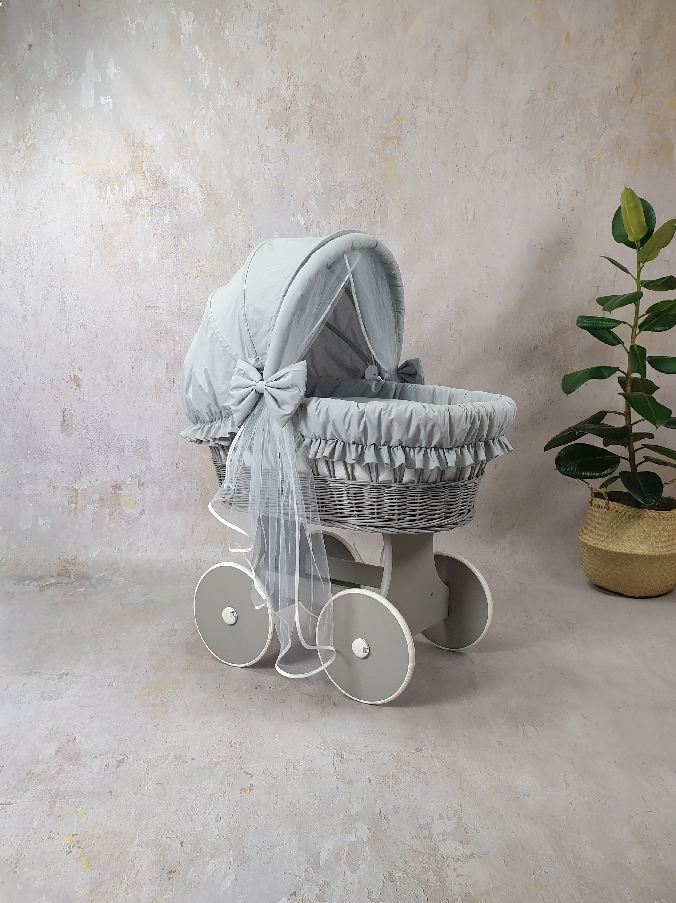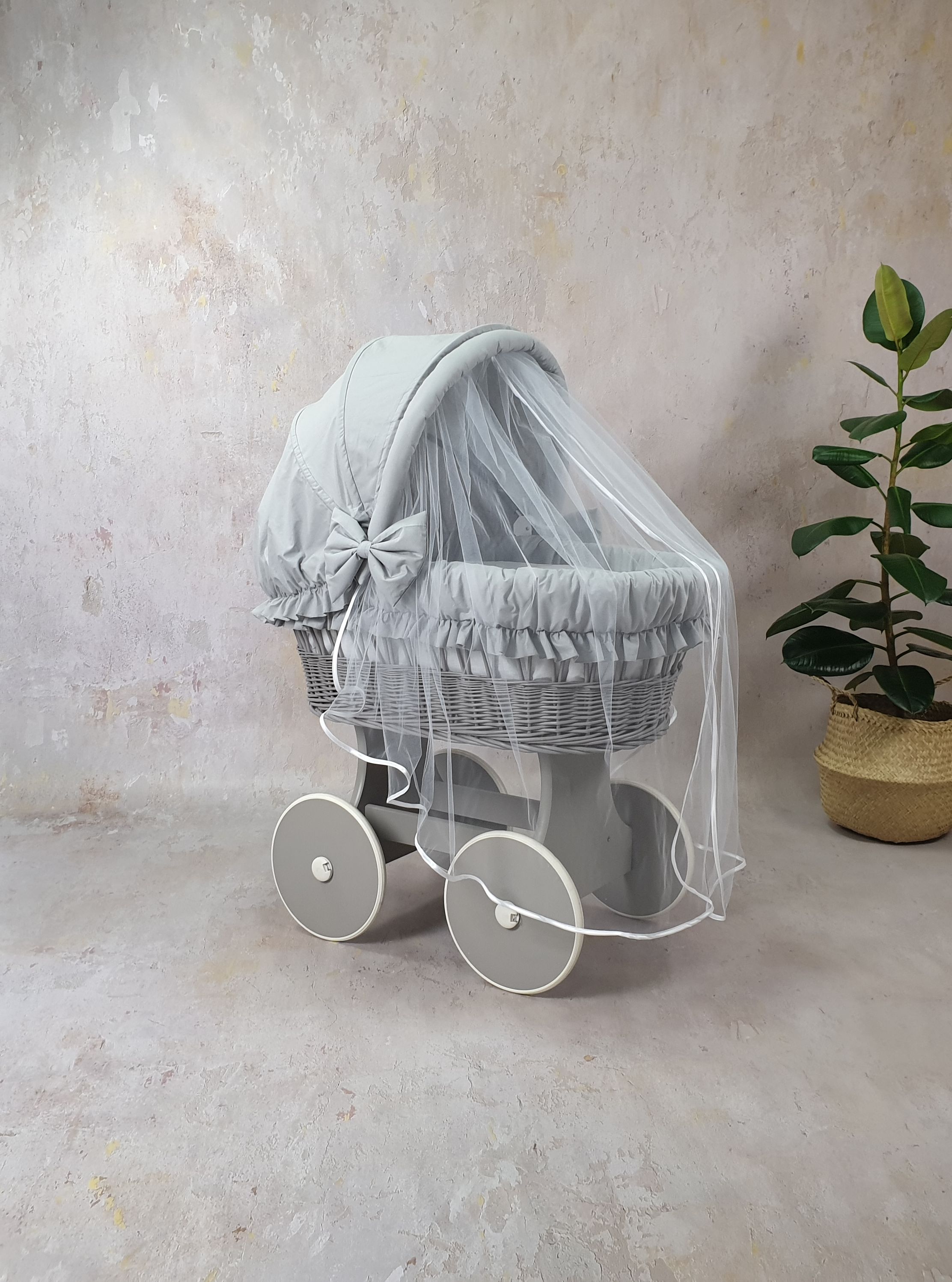Baby Stubenwagen-Set mit Ausstattung - Gestell und Räder weiß lackiert, Ausstattung grau