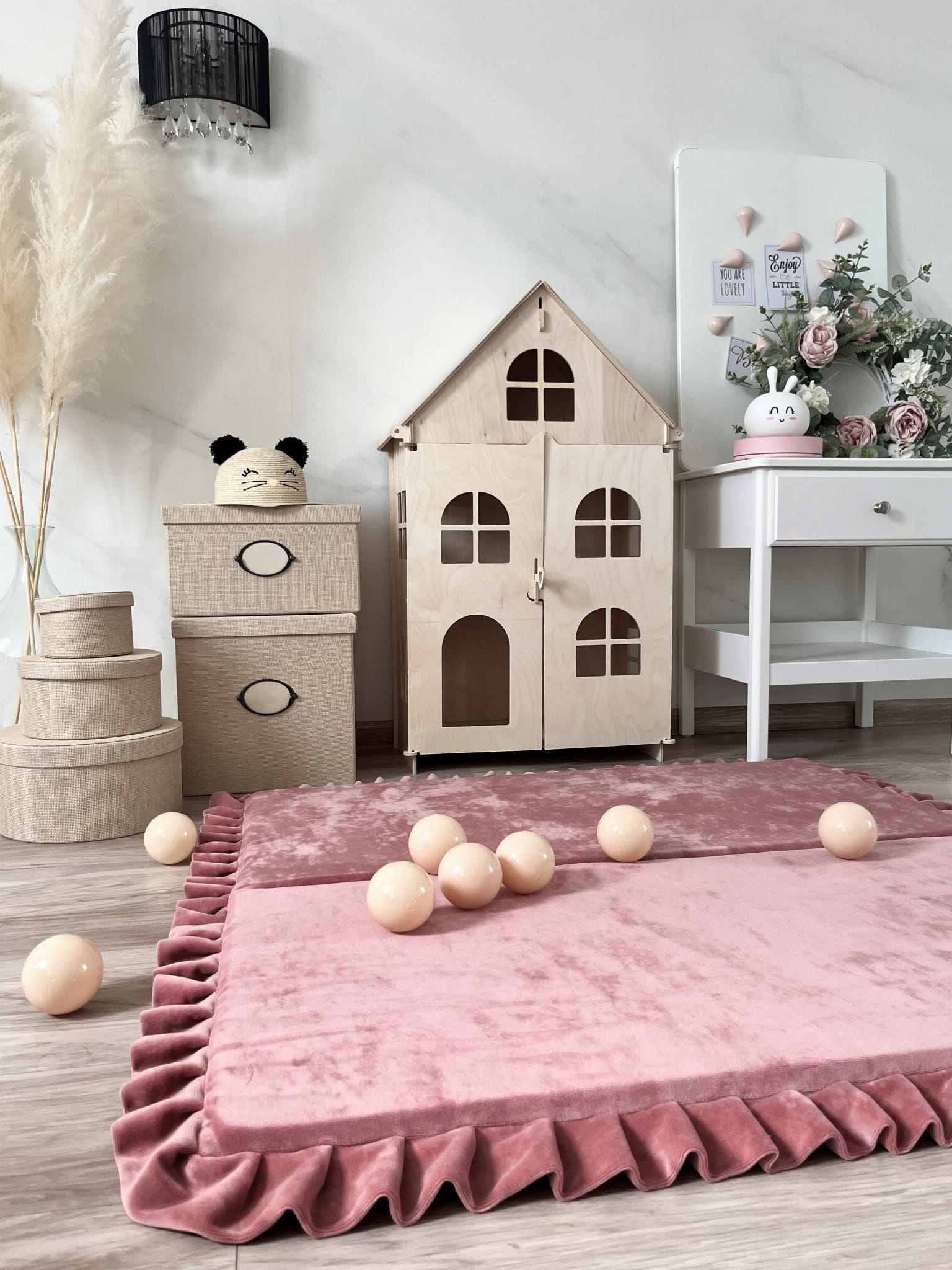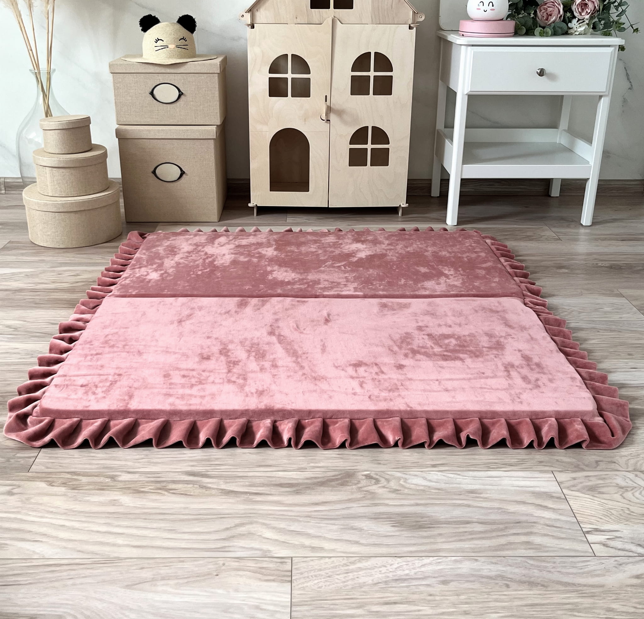 Die faltbare quadratische Spielmatte aus Velvet mit Rüschen ist nicht nur ein Ort zum Spielen, sondern kann auch als gemütliche Leseecke oder Entspannungsbereich genutzt werden. Die Kinder können sie flach auf den Boden legen oder zur Hälfte falten und an die Wand lehnen.