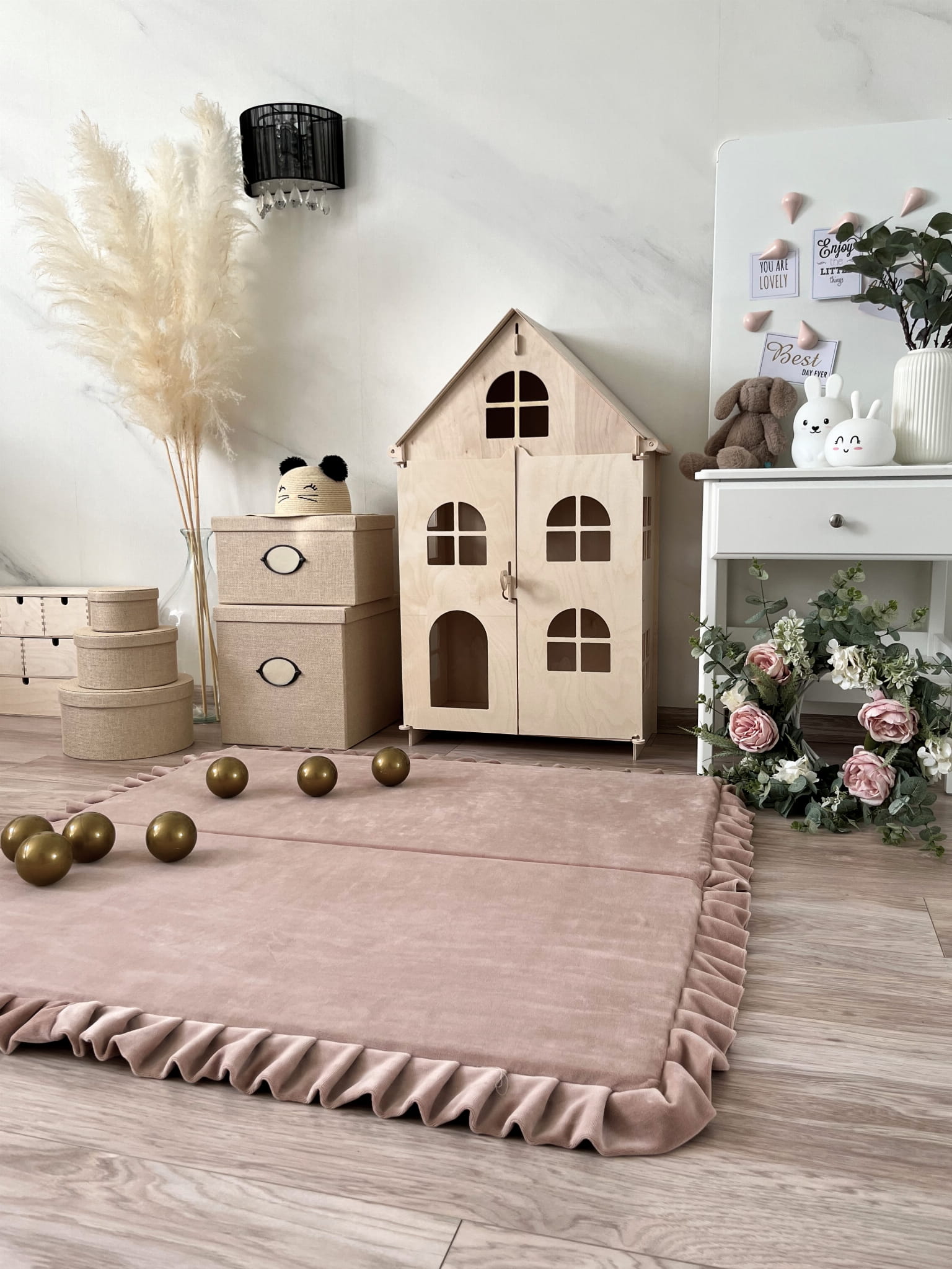 Ein besonderer Blickfang sind die Rüschen, die die Kanten der Matte schmücken. Die stilvollen Rüschen verleihen der Spielmatte eine verspielte und edle Note, die jedes Kinderzimmer in ein elegantes und bezauberndes Reich verwandelt.