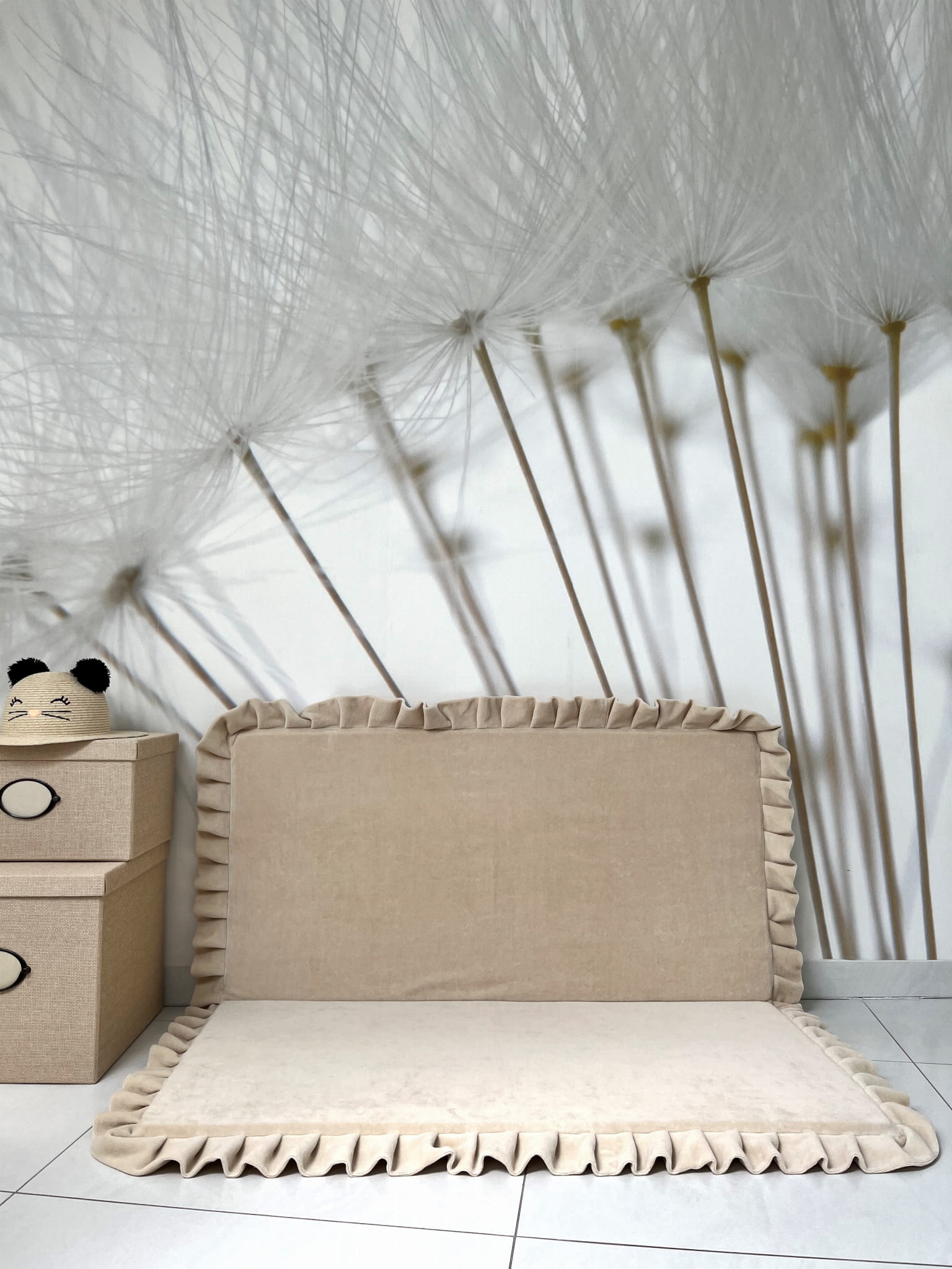 Die faltbare quadratische Spielmatte aus Velvet mit Rüschen ist nicht nur ein Ort zum Spielen, sondern kann auch als gemütliche Leseecke oder Entspannungsbereich genutzt werden. Die Kinder können sie flach auf den Boden legen oder zur Hälfte falten und an die Wand lehnen.