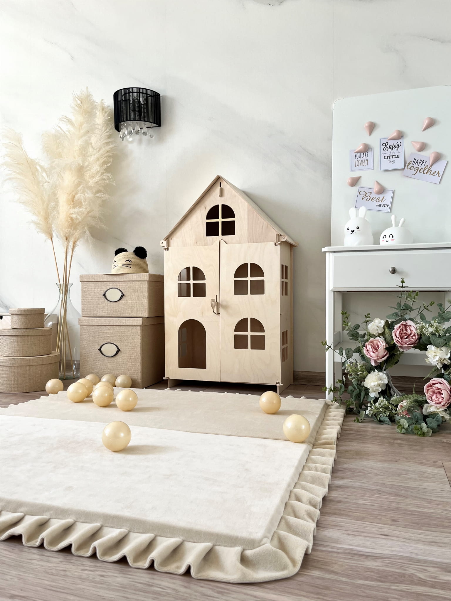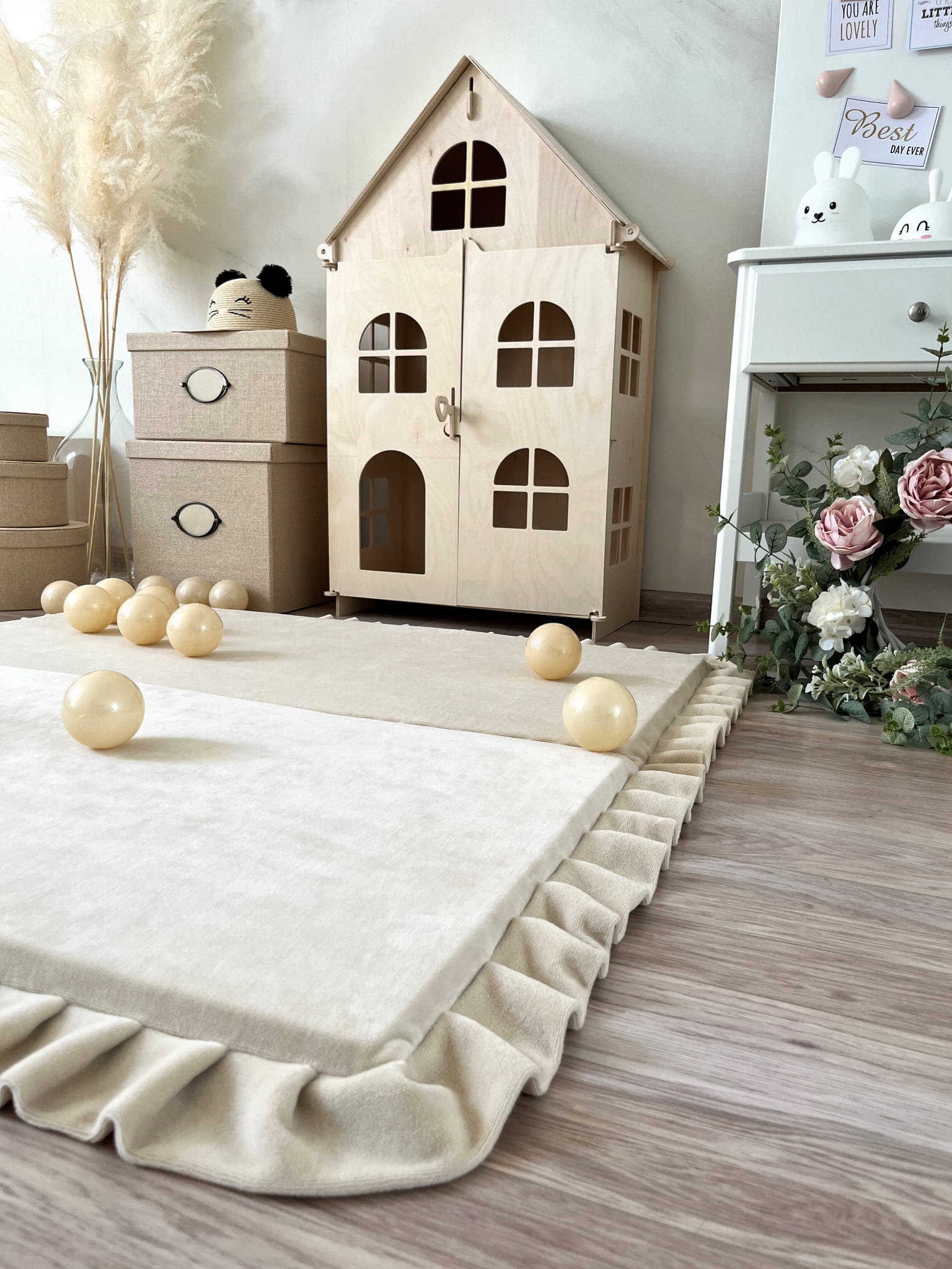 Ein besonderer Blickfang sind die Rüschen, die die Kanten der Matte schmücken. Die stilvollen Rüschen verleihen der Spielmatte eine verspielte und edle Note, die jedes Kinderzimmer in ein elegantes und bezauberndes Reich verwandelt.