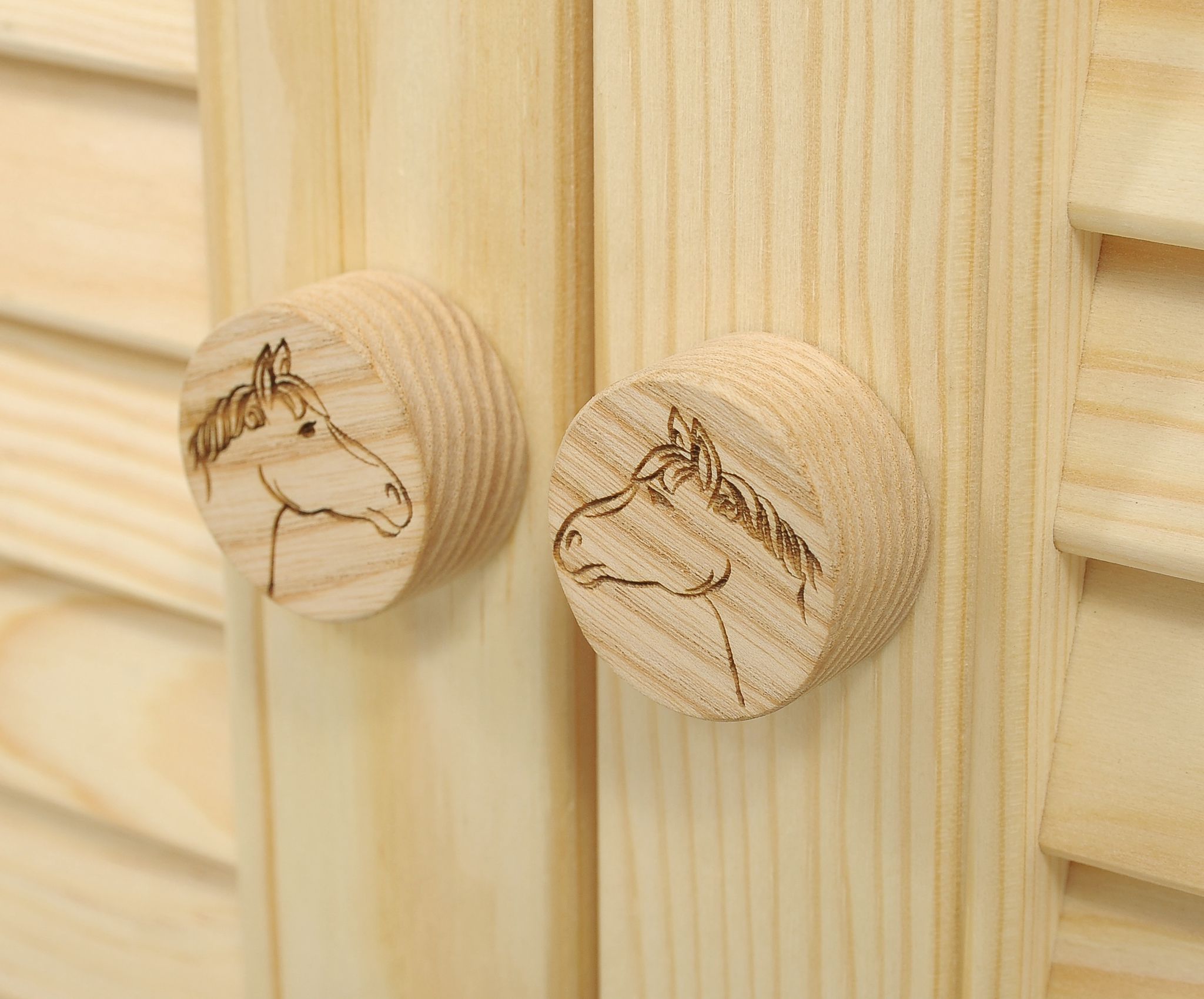 Im Inneren des Stalls befinden sich doppelte Halterungen für die Aufbewahrung von Hobby Horse-Zubehör - Pferdehalfter, Anbindegurte und andere Gegenstände können bequem untergebracht werden. Im unteren Teil des Pferdestalls können Sie auf einer Holzablage zusätzlich Derrieres, Ohrenschützer und alles andere Notwendige für das Hobby Horse Pferd und seinen Reiter unterbringen.