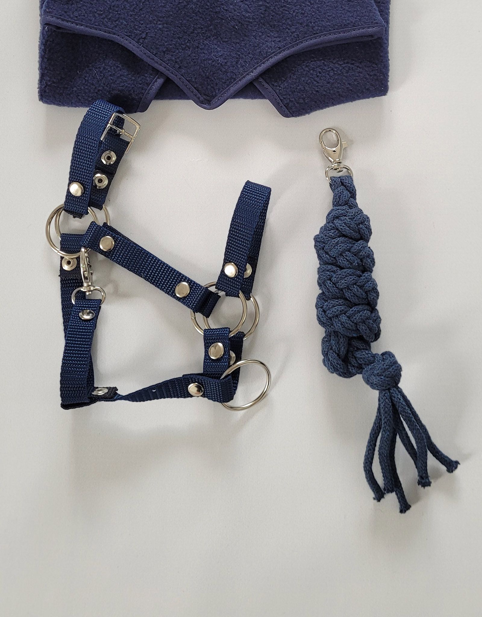 Ein praktisches und haltbares Halfter für das Hobby-Pferd. Hergestellt aus hochwertigem Gurtband von 1,5 cm Breite. Verstellbare Schnalle für eine perfekte Anpassung an das Pferd. Einfacher Verschluss mit Karabinerhaken. Metallelemente des Halfters - wie die Verschlüsse, Metallringe, Schnalle zum Verstellen und Karabinerhakenverschluss in silberner Farbe. Alles elegant und praktisch. Das Halfter ist einfach zu handhaben, robust und schmutzabweisend. Es werden viele modische Farben angeboten, die perfekt auf unsere Hobbypferde abgestimmt werden können.