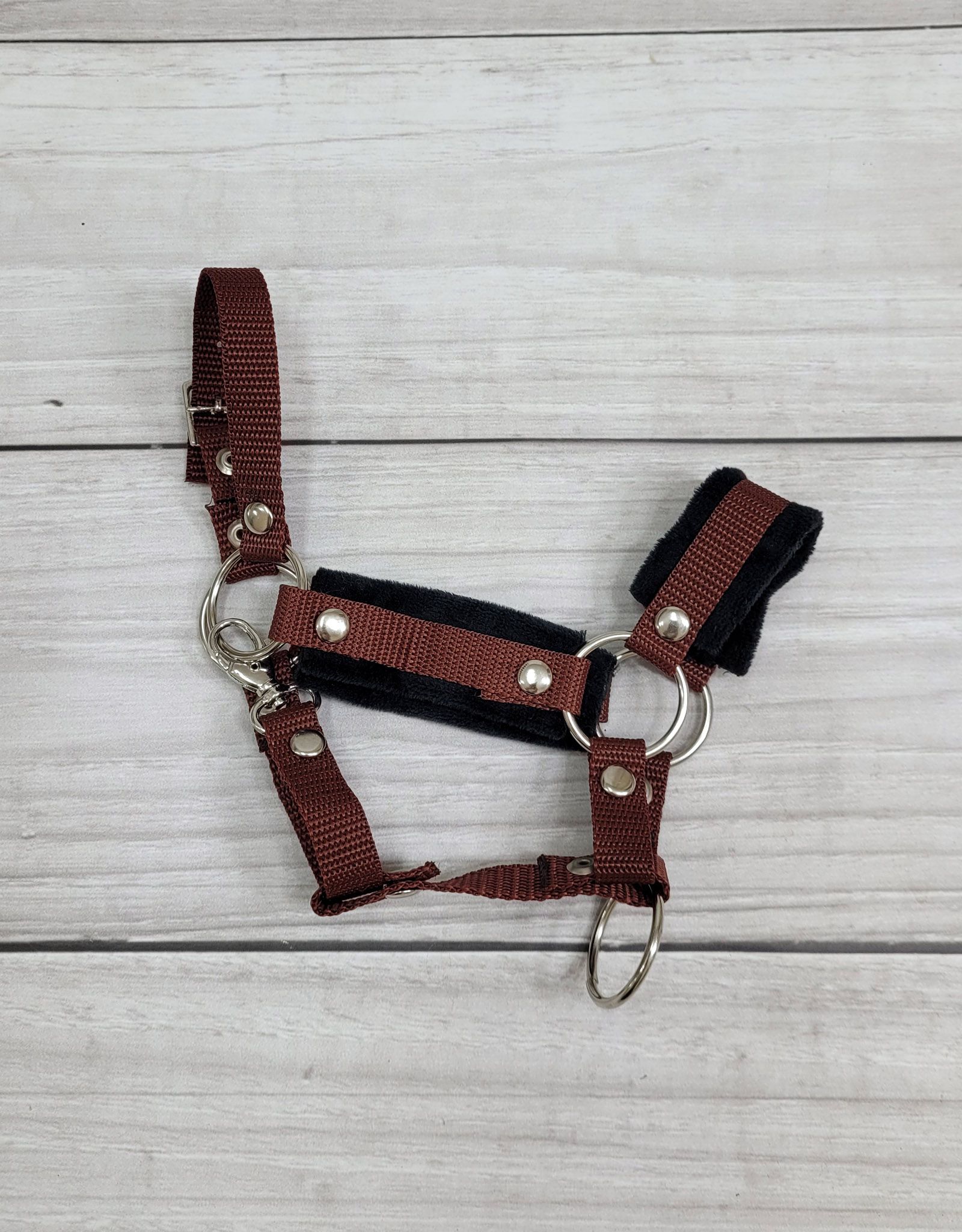 Ein praktisches und haltbares Halfter mit Pelz für das Hobby-Pferd. Hergestellt aus hochwertigem Gurtband von 1,5 cm Breite und weichem Minky-Material. Verstellbare Schnalle für eine perfekte Anpassung an das Pferd. Einfacher Verschluss mit Karabinerhaken. Metallelemente des Halfters - wie die Verschlüsse, Metallringe, Schnalle zum Verstellen und Karabinerhakenverschluss in silberner Farbe. Alles elegant und praktisch. Das Halfter ist einfach zu handhaben, robust und schmutzabweisend. Es werden viele modische Farben angeboten, die perfekt auf unsere Hobbypferde abgestimmt werden können.