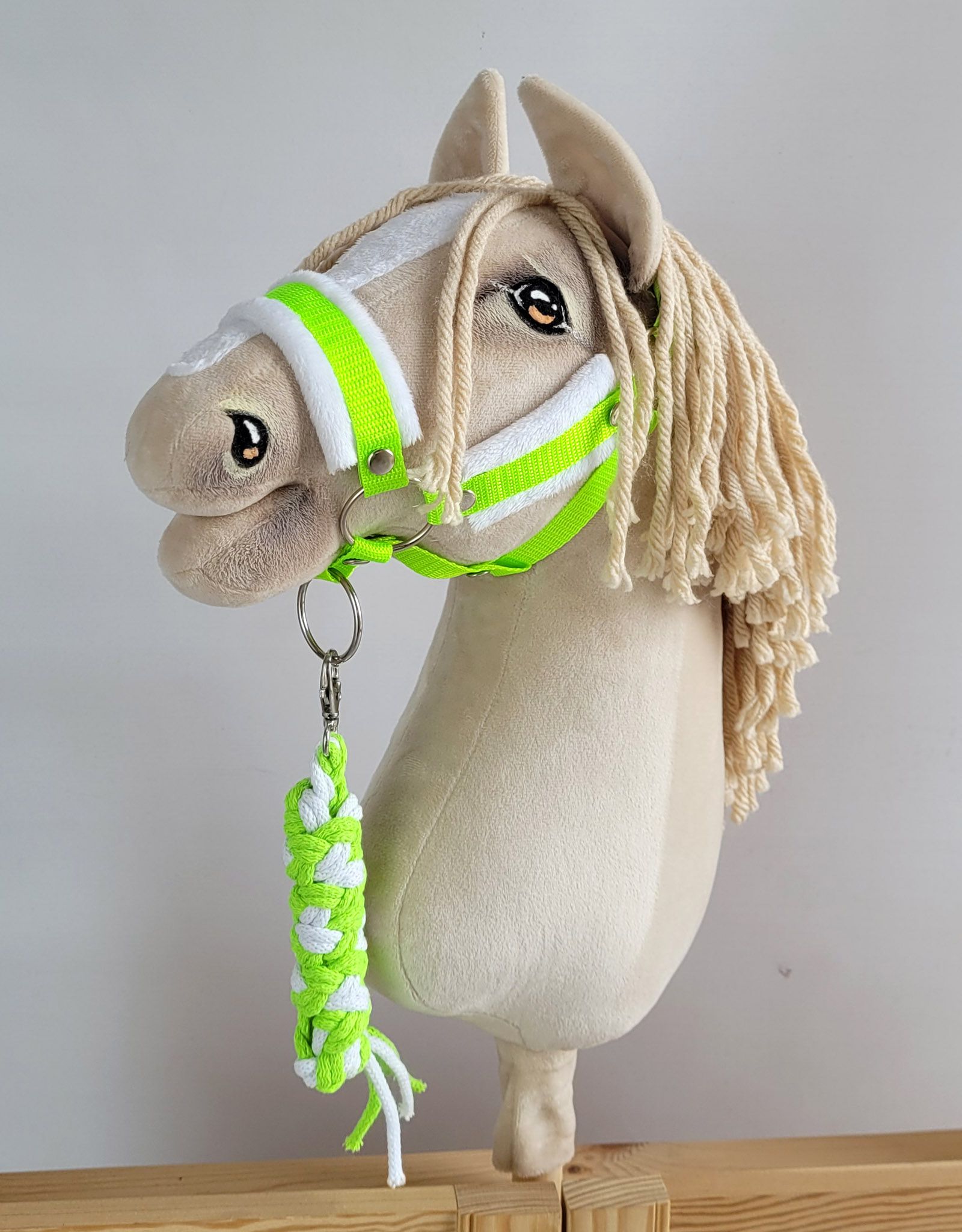 Ein praktisches und haltbares Halfter mit Pelz für das Hobby-Pferd. Hergestellt aus hochwertigem Gurtband von 1,5 cm Breite und weichem Minky-Material. Verstellbare Schnalle für eine perfekte Anpassung an das Pferd. Einfacher Verschluss mit Karabinerhaken. Metallelemente des Halfters - wie die Verschlüsse, Metallringe, Schnalle zum Verstellen und Karabinerhakenverschluss in silberner Farbe. Alles elegant und praktisch. Das Halfter ist einfach zu handhaben, robust und schmutzabweisend. Es werden viele modische Farben angeboten, die perfekt auf unsere Hobbypferde abgestimmt werden können.