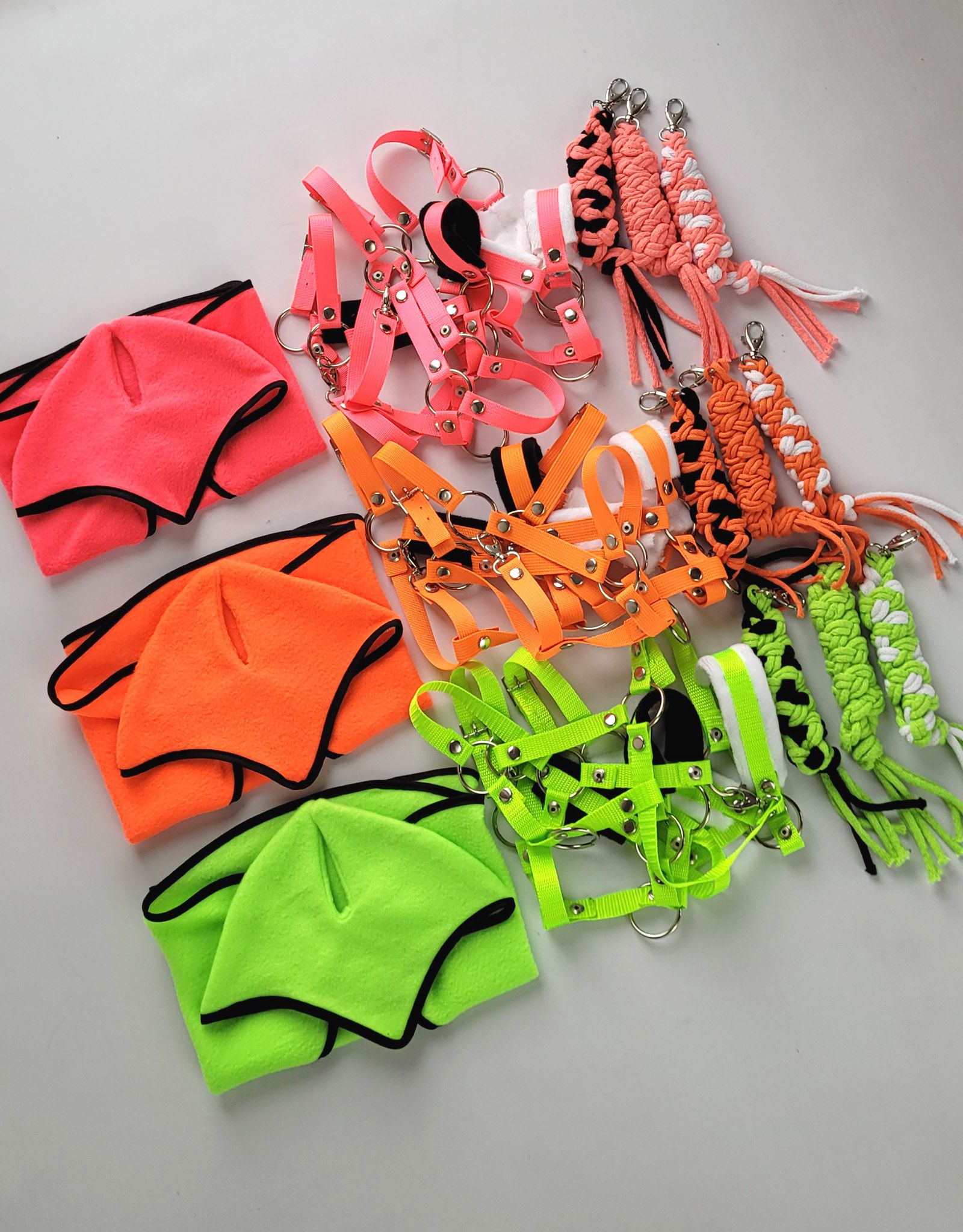 Set für Hobby Horse: Die Verstellbare Halfter A3 mit weißem Pelz + Halfter aus doppelt geflochtener Korde neon