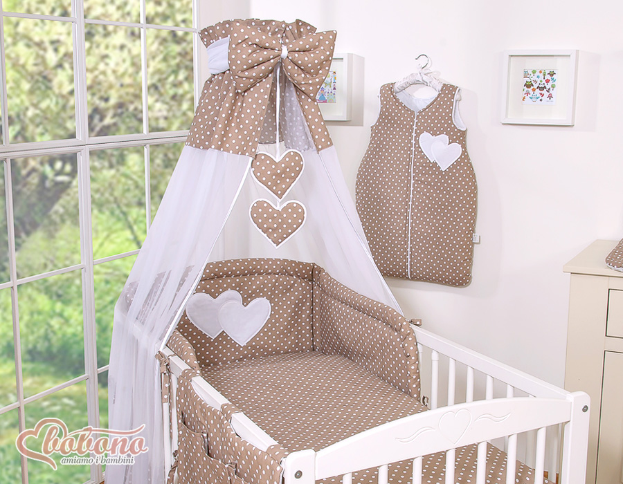 Himmel aus Chiffon für Babybett - Hängende Herzen Braun-Punktemuster Wunderschöner Himmel aus Chiffon. Schutz vor direktem Lichteinfall und Zugluft. Höhste Qualität und solide Verarbeitung. Mit Hilfe einer Himmelstange kann der Himmel schön über dem Bettchen platziert werden.