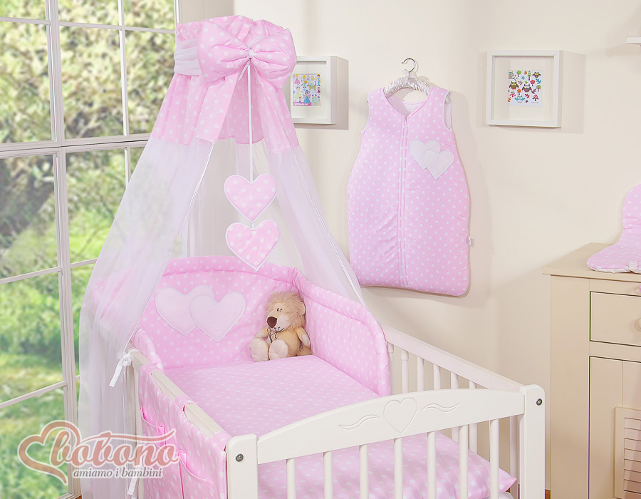 Himmel aus Chiffon - Hängende Herzen Rosa-Punktemuster Wunderschöner Himmel aus Chiffon. Schutz vor direktem Lichteinfall und Zugluft. Höhste Qualität und solide Verarbeitung. Mit Hilfe einer Himmelstange kann der Himmel schön über dem Bettchen platziert werden.