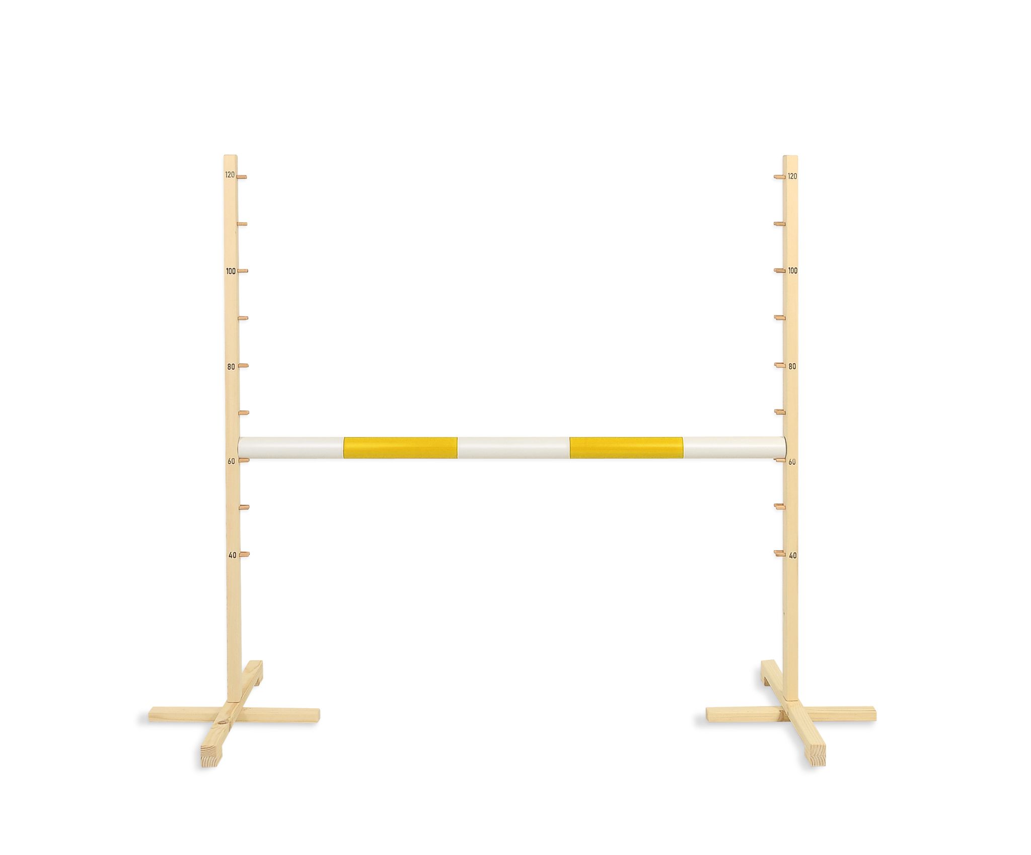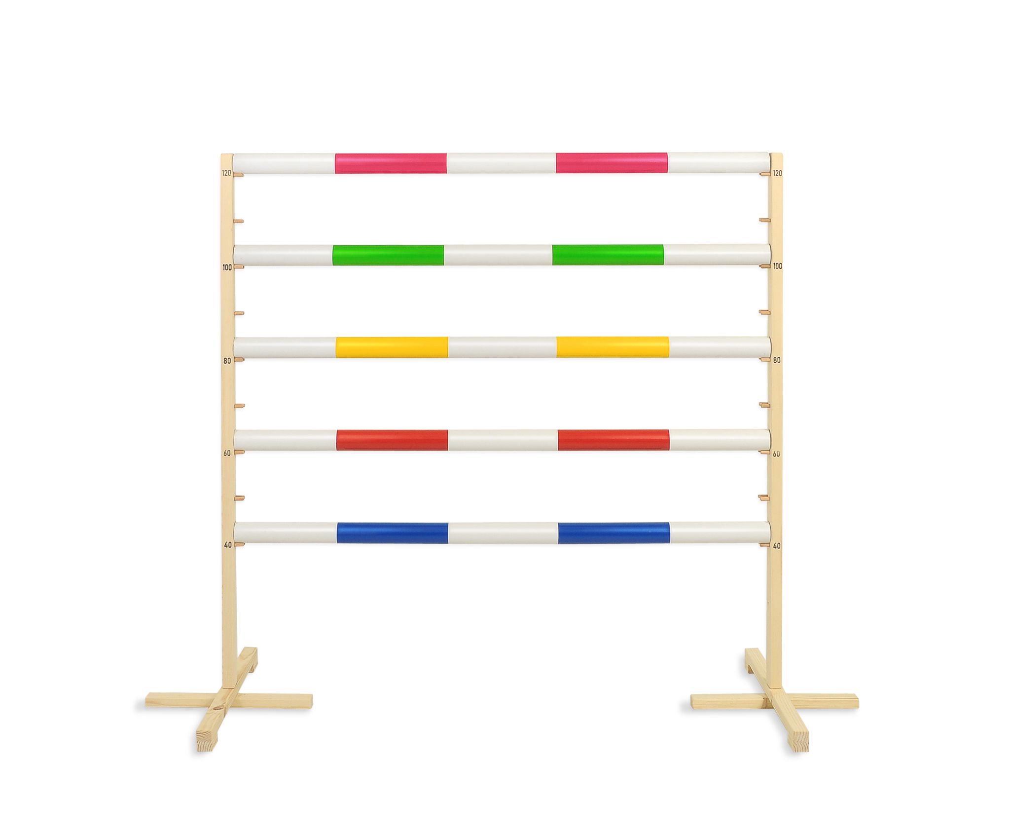 Das Hindernis ist haltbar und sicher, aus perfekt geschliffenem Kiefernholz gefertigt, damit sich das Kind beim Springen oder Bewegen des Ständers nicht verletzt. Das Hindernis hat stabile Füße, um sicher zu stehen. Die Stäbe sind aus Kunststoff, leicht und in mehreren Farbvarianten erhältlich.