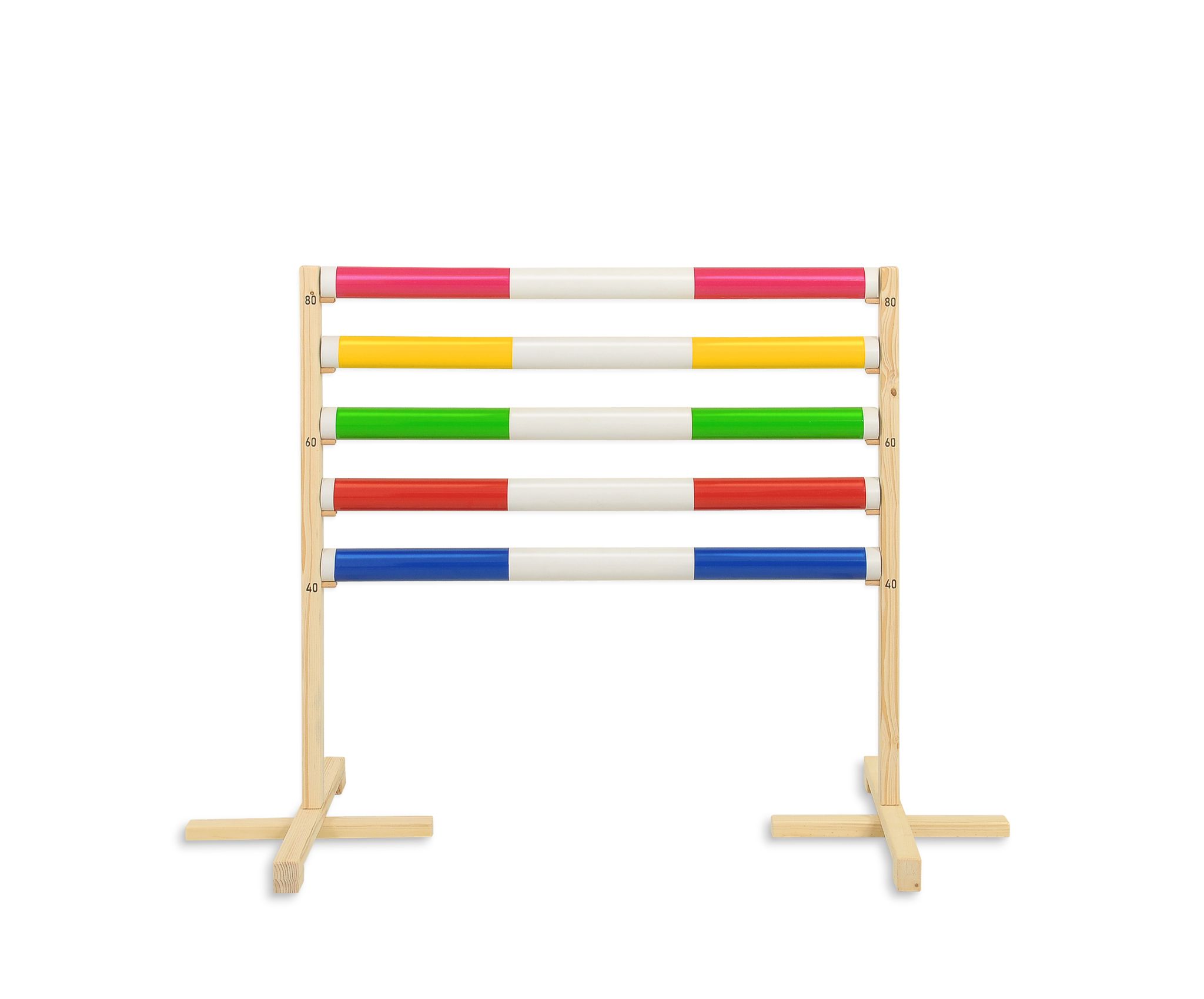 Das Hindernis ist haltbar und sicher, aus perfekt geschliffenem Kiefernholz gefertigt, damit sich das Kind beim Springen oder Bewegen des Ständers nicht verletzt. Das Hindernis hat stabile Füße, um sicher zu stehen. Die Stäbe sind aus Kunststoff, leicht und in mehreren Farbvarianten erhältlich.