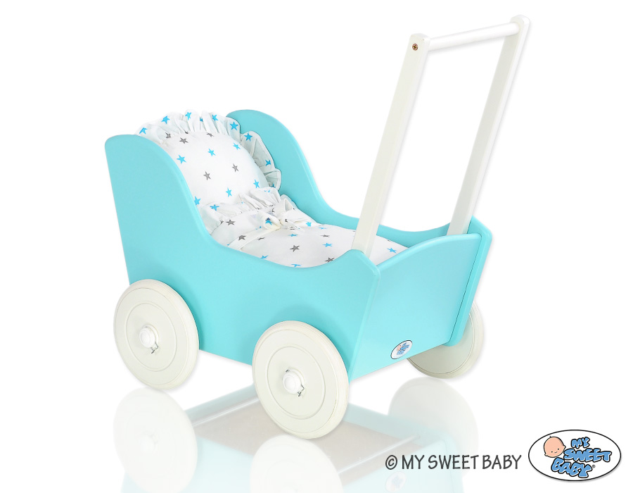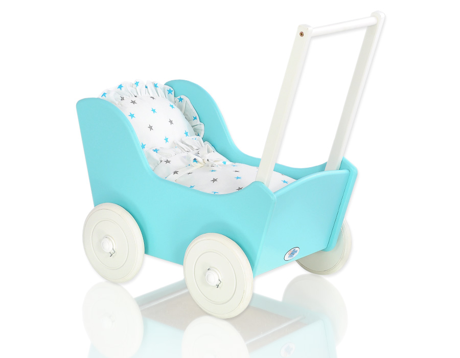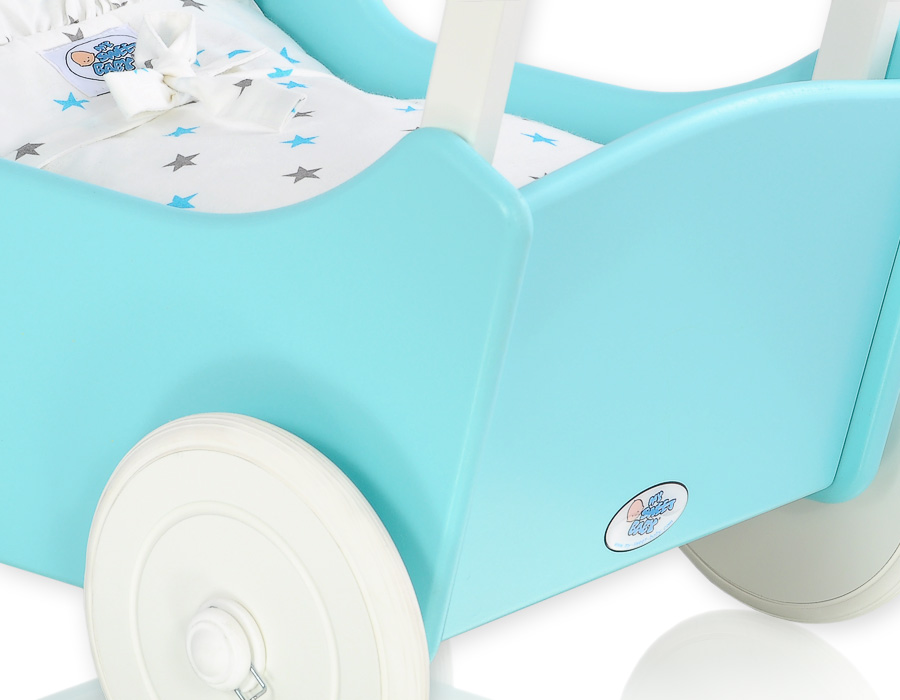 Puppenawagen mit Bettwäsche Mila Türkis Weiß 135027-623 Ein wundervoller Spiel - Puppenwagen perfekt als Geschenk geeignet.Der Wagen ist aus sicheren Materialien gefertigt.