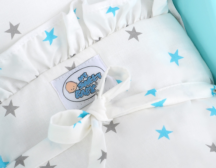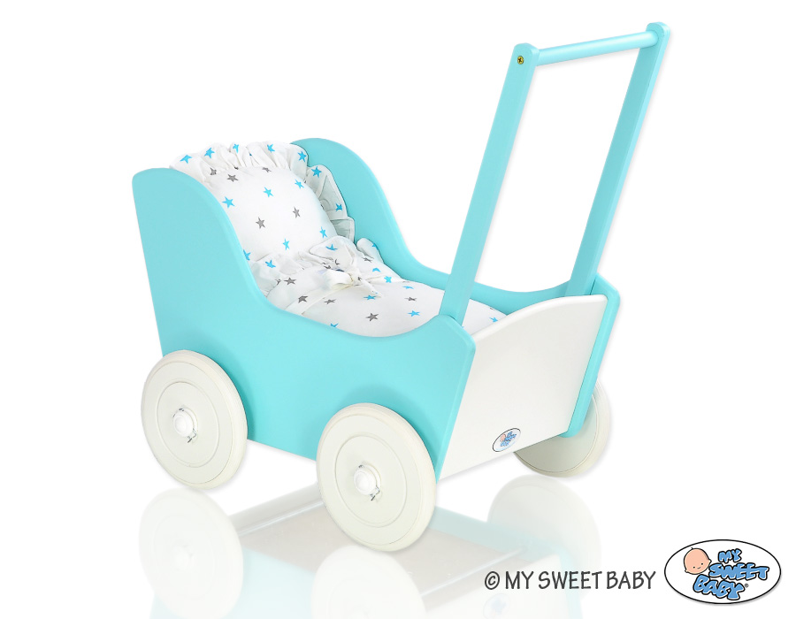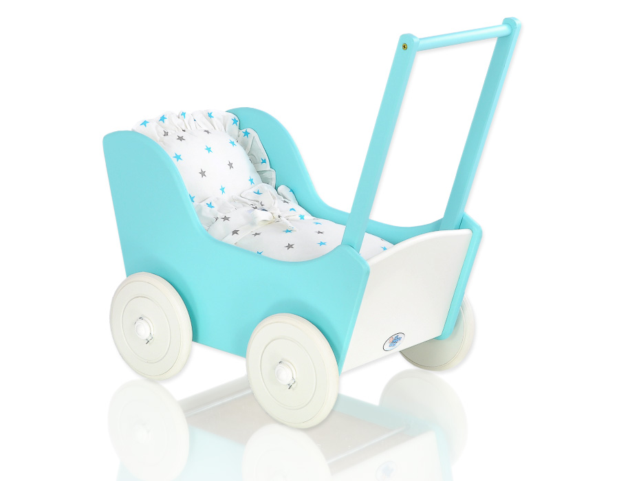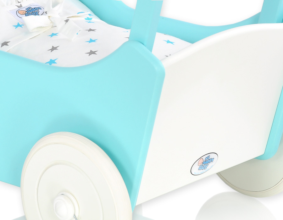Puppenawagen mit Bettwäsche Mila Weiß Türkis 135026-623 Ein wundervoller Spiel - Puppenwagen perfekt als Geschenk geeignet.Der Wagen ist aus sicheren Materialien gefertigt.