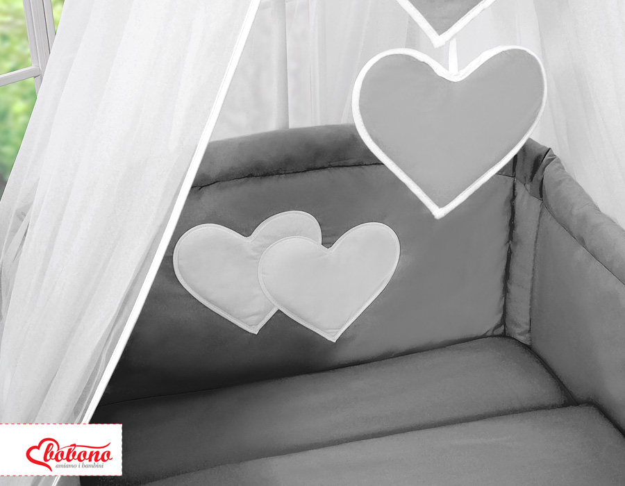 Stubenwagen » Bettwäsche für Babys » Bettwäsche für Babybett HERZEN » Bettwäsche Sets für Babybett 140cm » Bettwäsche Set 7-tlg 100x135 cm mit Himmel dicken Stoff » Kinderbett 100x135 cm Bettwäsche Set 7-tlg mit Himmel - Hängende Herzen anthrazit