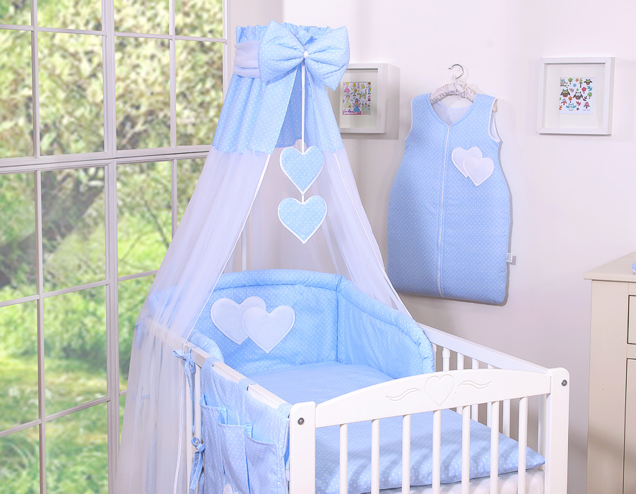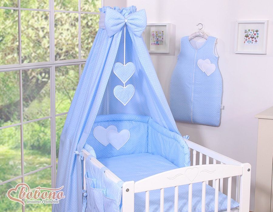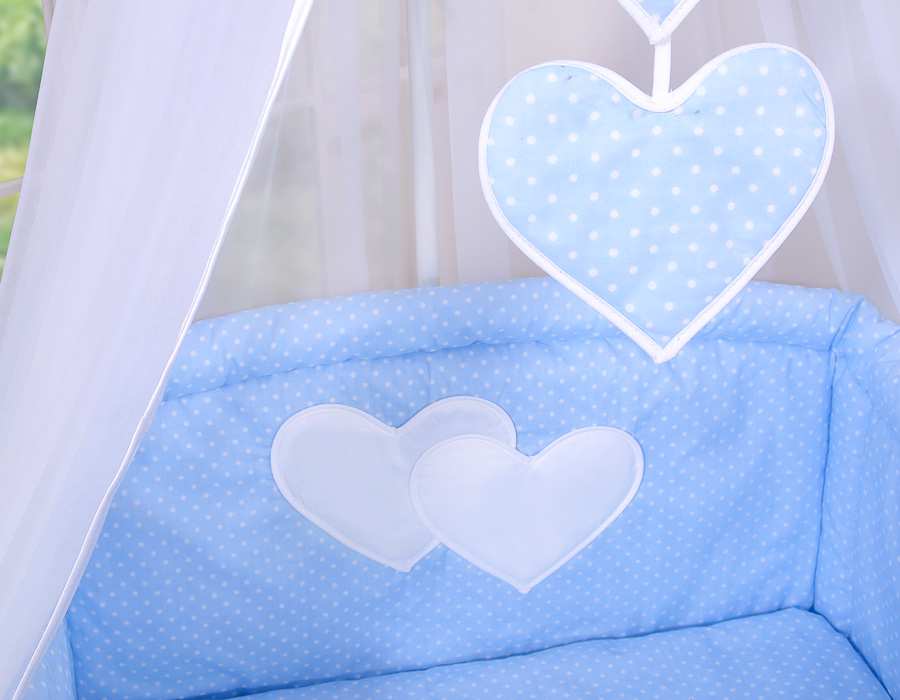 Kinderbett Bettwäsche Set 7-tlg mit Himmel - Hängende Herzen Blau-Punktemuster