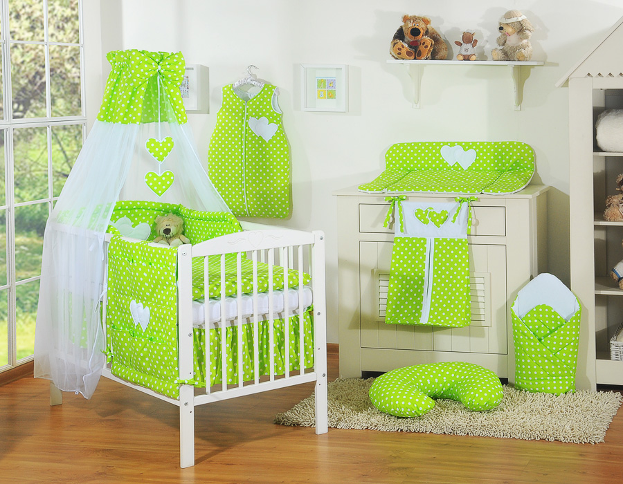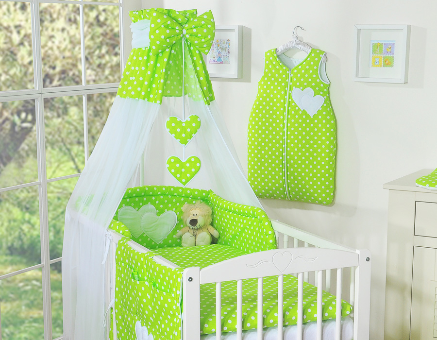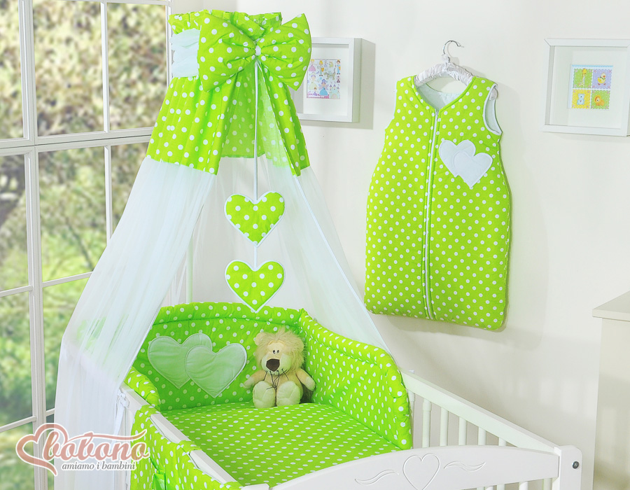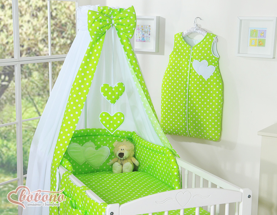 Kinderbett Bettwäsche Set 7-tlg mit Himmel - Hängende Herzen Grün-Punktemuster
