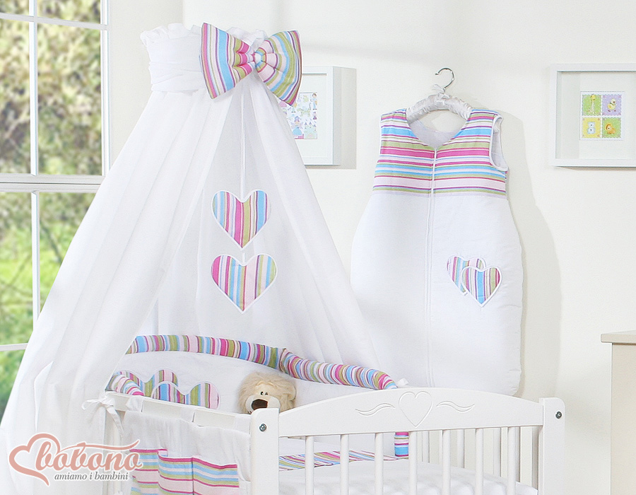 Kinderbett Bettwäsche Set 7-tlg mit Himmel - Hängende Herzen lila gestreift