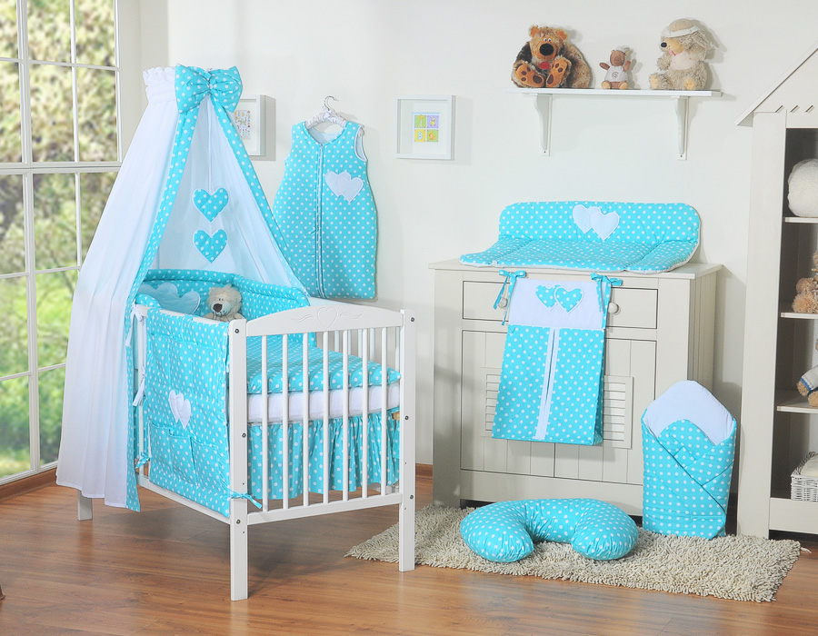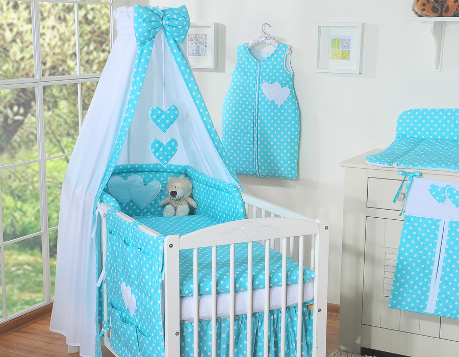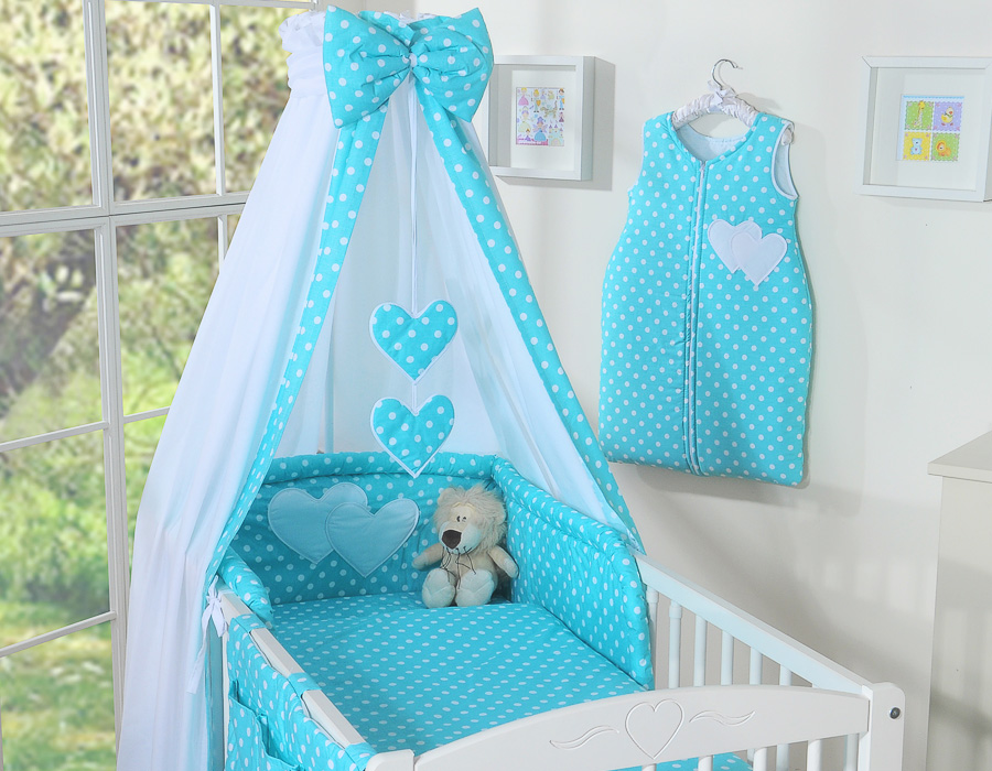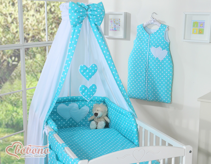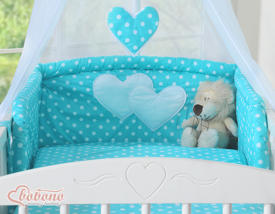 Kinderbett Bettwäsche Set 7-tlg mit Himmel - Hängende Herzen Türkis-Punktemuster