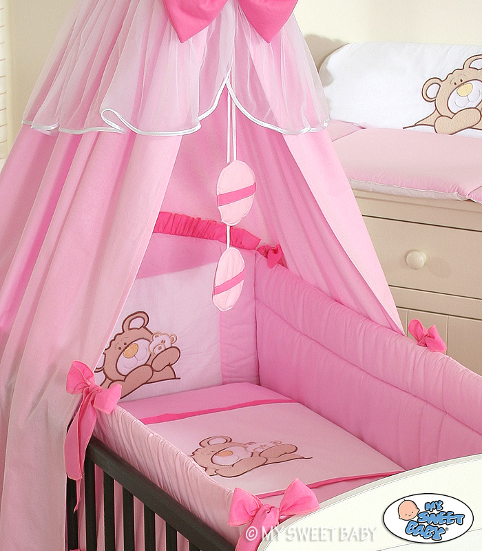 Stubenwagen » Bettwäsche für Babys » Bettwäsche für Babybett TEDDY BÄR BARNABA » Bettwäsche Sets für Babybett 120cm » Bettwäsche Set 7-tlg mit Himmel (L) » Kinderbett Bettwäsche Set 7-tlg mit Himmel (L60) - Teddy Bär Barnaba rosa