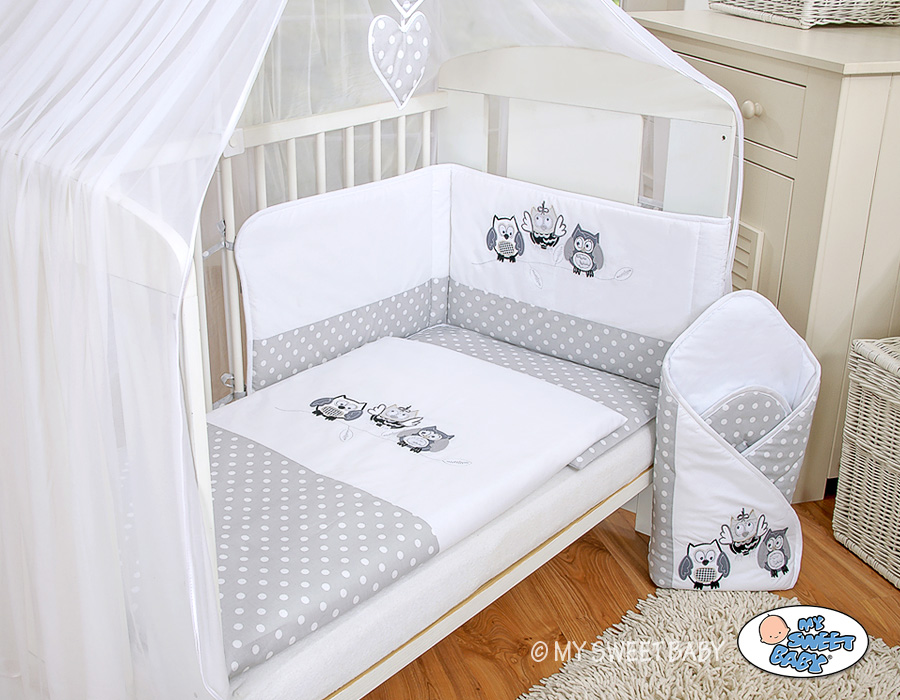 Kinderbett Bettwäsche Set 7-tlg mit Moskitonetz - Eulen Bigi Zibi & Adele grau-schwarzKinderbett Bettwäsche Set 7-tlg mit Moskitonetz - Eulen Bigi Zibi & Adele grau-schwarz