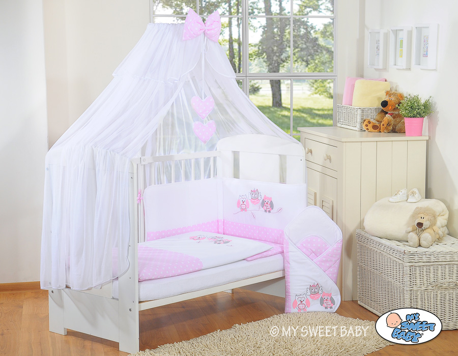 Kinderbett Bettwäsche Set 7-tlg mit Moskitonetz - Eulen Bigi Zibi & Adele rosaKinderbett Bettwäsche Set 7-tlg mit Moskitonetz - Eulen Bigi Zibi & Adele rosa