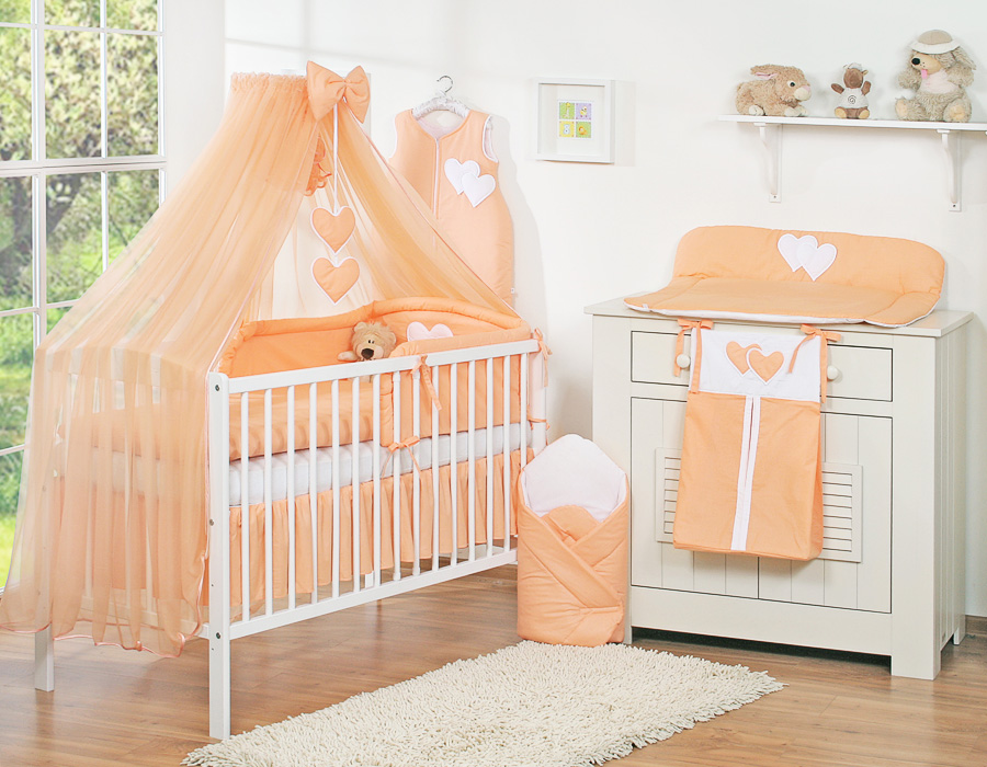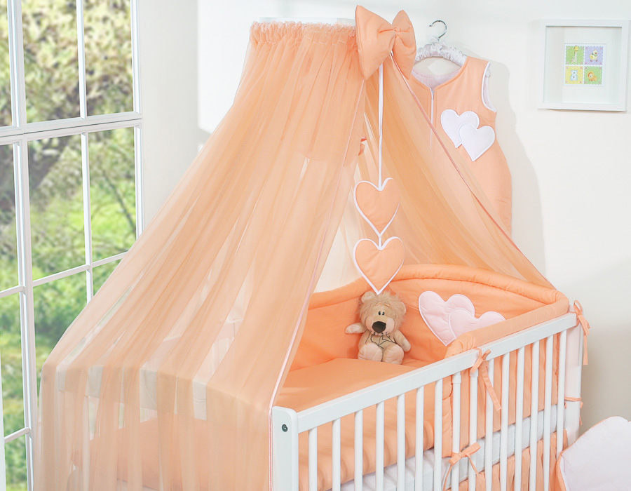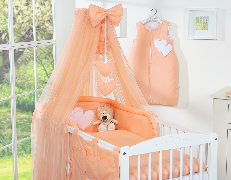 Stubenwagen » Bettwäsche für Babys » Bettwäsche für Babybett HERZEN » Bettwäsche Sets für Babybett 120cm » Bettwäsche Set 7-tlg mit Moskitonetz » Kinderbett Bettwäsche Set 7-tlg mit Moskitonetz für Babybett - Hängende Herzen pfirsich
