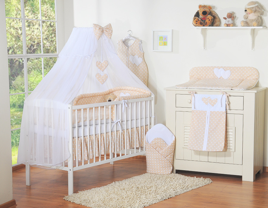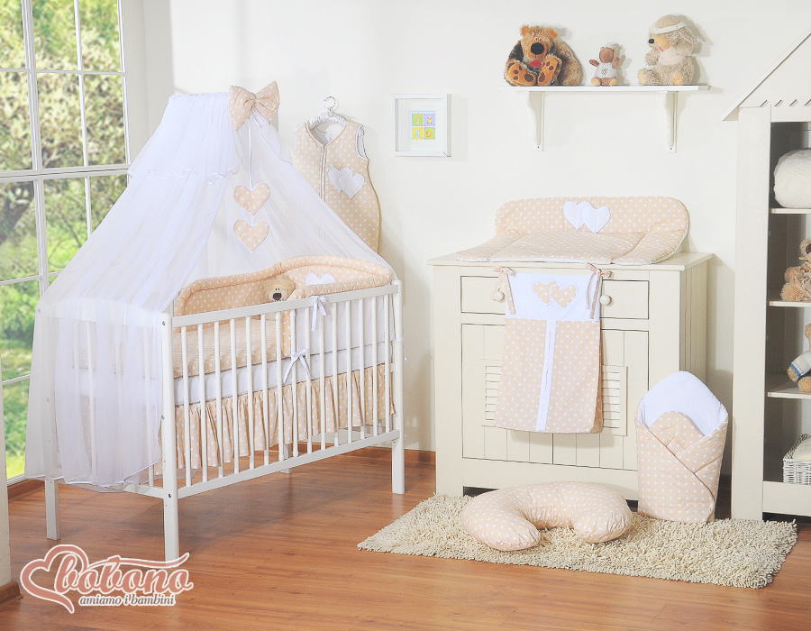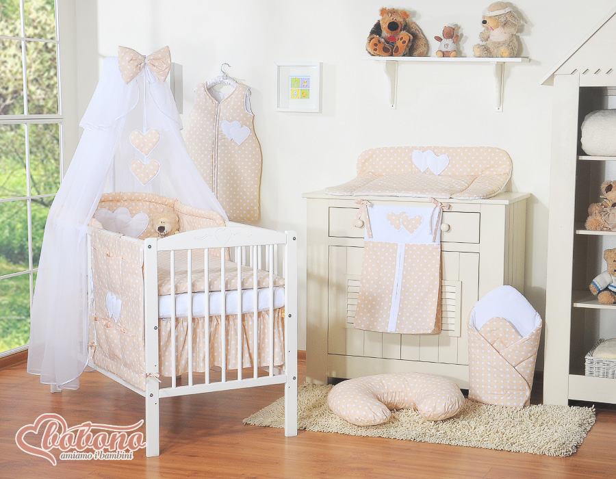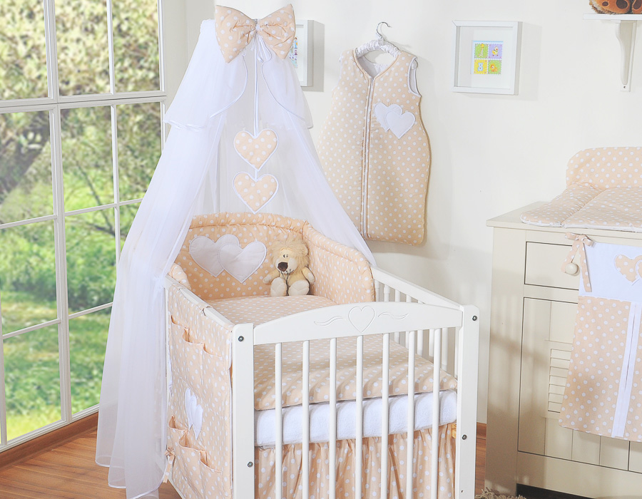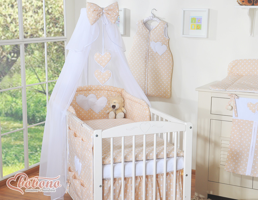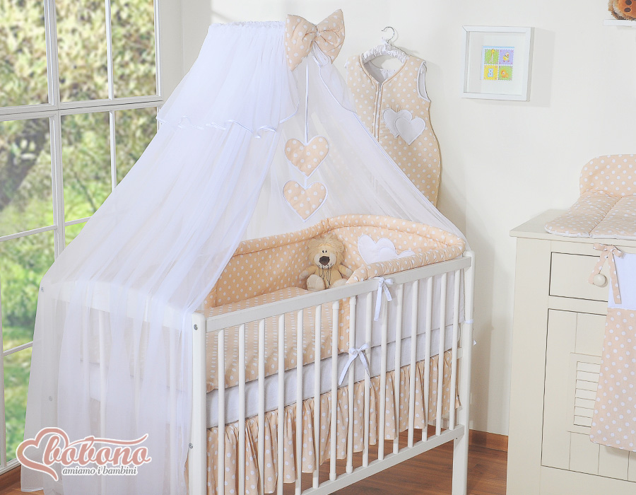 Stubenwagen » Bettwäsche für Babys » Bettwäsche für Babybett HERZEN » Bettwäsche Sets für Babybett 120cm » Bettwäsche Set 7-tlg mit Moskitonetz » Kinderbett Bettwäsche Set 7-tlg mit Moskitonetz - Hängende Herzen Beige-Punktemuster