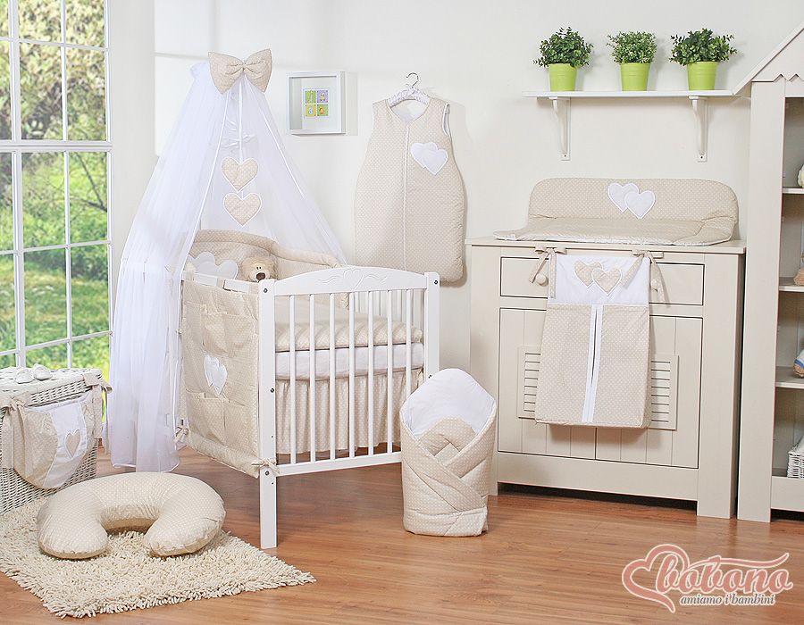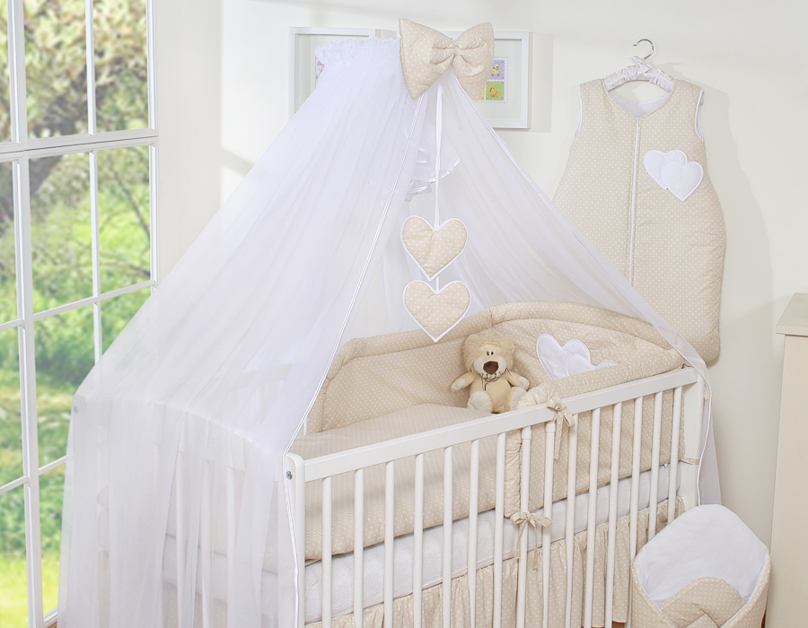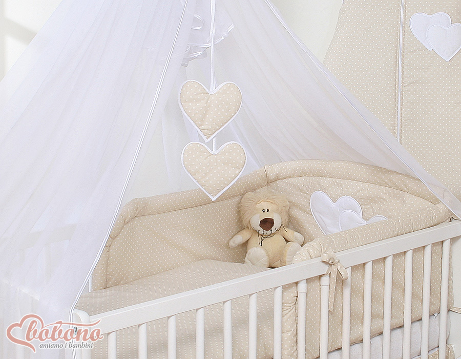 Stubenwagen » Bettwäsche für Babys » Bettwäsche für Babybett HERZEN » Bettwäsche Sets für Babybett 120cm » Bettwäsche Set 7-tlg mit Moskitonetz » Kinderbett Bettwäsche Set 7-tlg mit Moskitonetz - Hängende Herzen Beige-Punktemuster