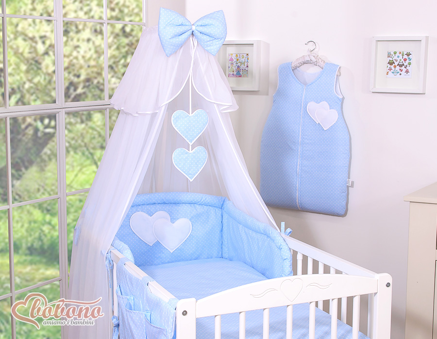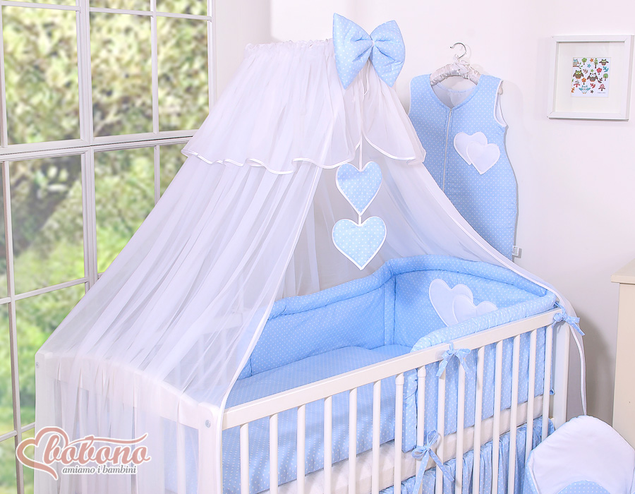 Kinderbett Bettwäsche Set 7-tlg mit Moskitonetz - Hängende Herzen Blau-Punktemuster