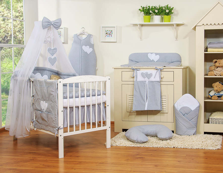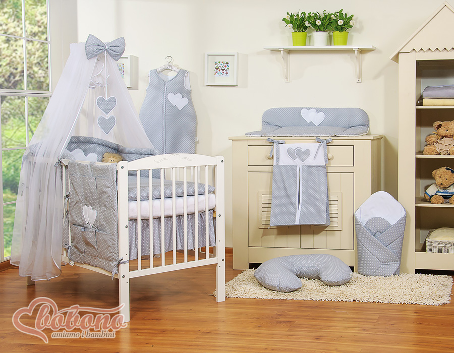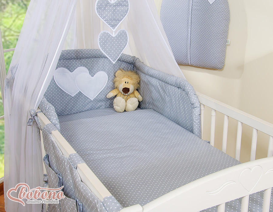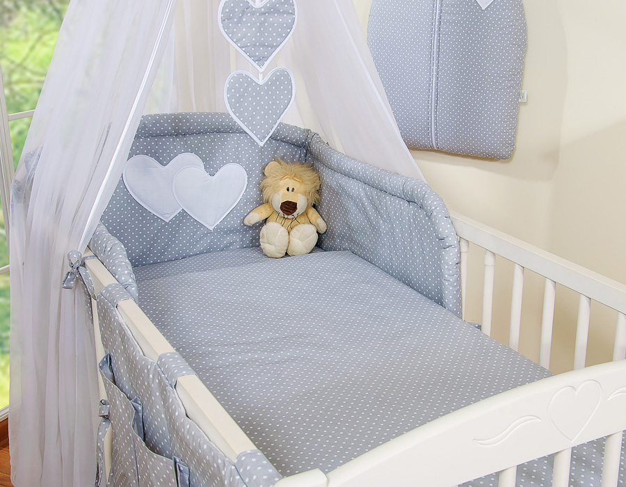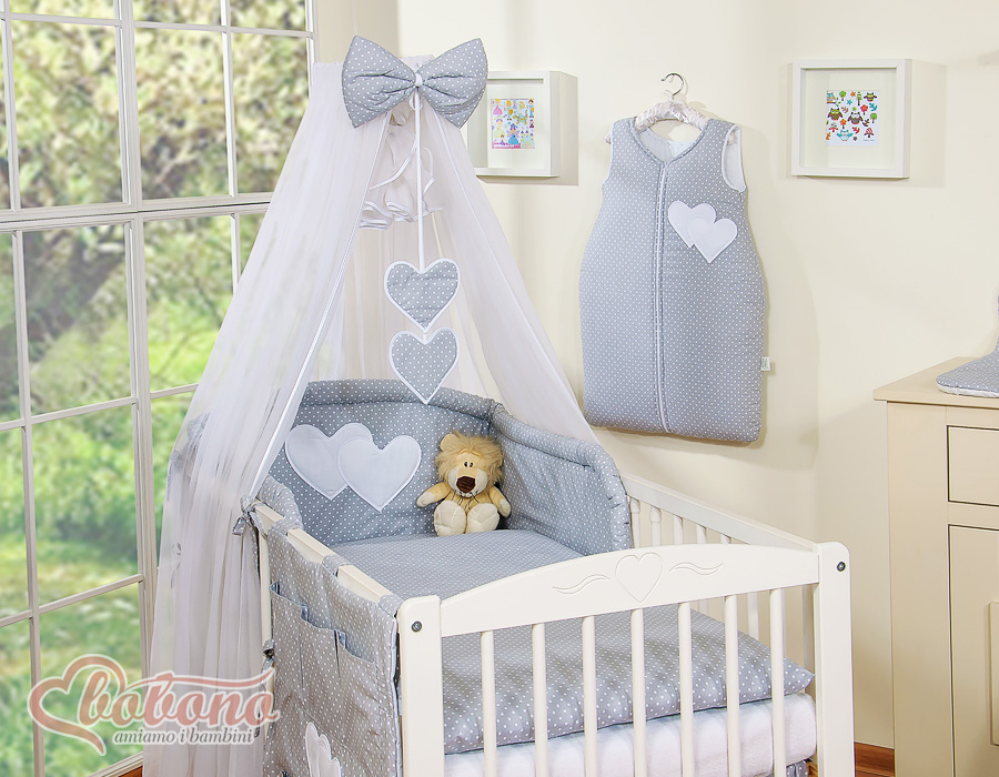 Kinderbett Bettwäsche Set 7-tlg mit Moskitonetz - Hängende Herzen Grau-Punktemuster