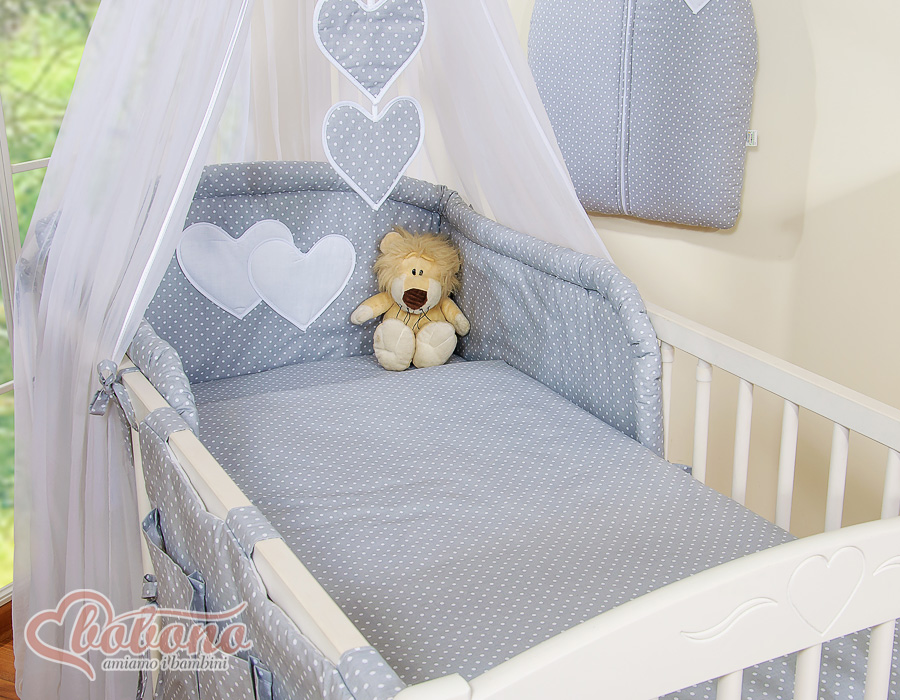Stubenwagen » Bettwäsche für Babys » Bettwäsche für Babybett HERZEN » Bettwäsche Sets für Babybett 120cm » Bettwäsche Set 7-tlg mit Moskitonetz » Kinderbett Bettwäsche Set 7-tlg mit Moskitonetz - Hängende Herzen Grau-Punktemuster