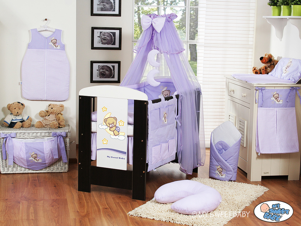 Stubenwagen » Bettwäsche für Babys » Bettwäsche für Babybett GUTE NACHT » Bettwäsche Sets für Babybett 140cm » Bettwäsche Set 7-tlg mit Moskitonetz (S) » Kinderbett Bettwäsche Set 7-tlg mit Moskitonetz (S70) - Gute Nacht lila