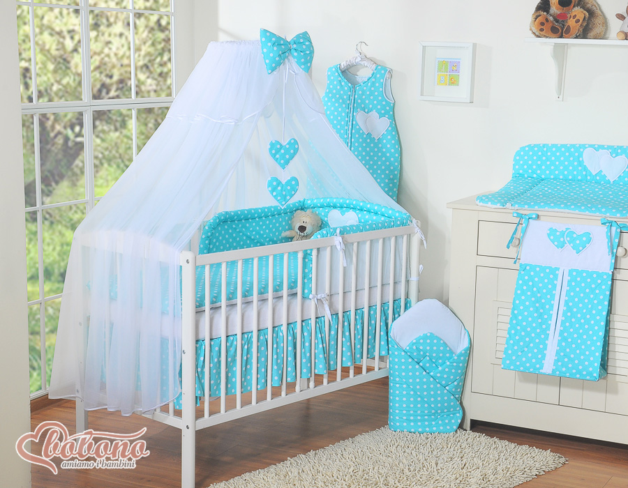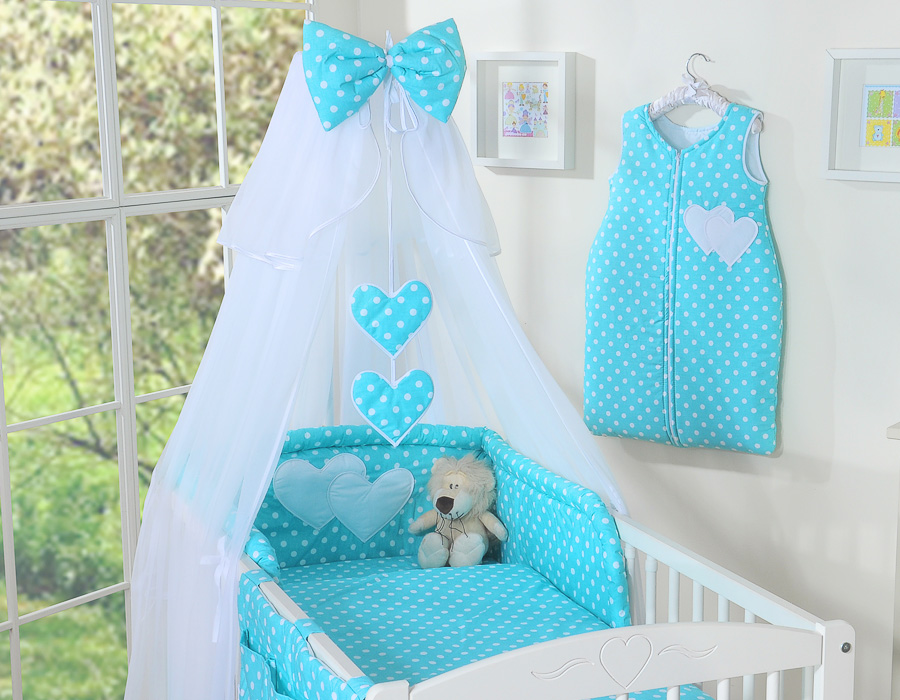 Stubenwagen » Bettwäsche für Babys » Bettwäsche für Babybett HERZEN » Bettwäsche Sets für Babybett 120cm » Bettwäsche Set 7-tlg mit Moskitonetz » Kinderbett Hängende Herzen x180Bettwäsche Set 7-tlg mit Moskitonetz - Türkis